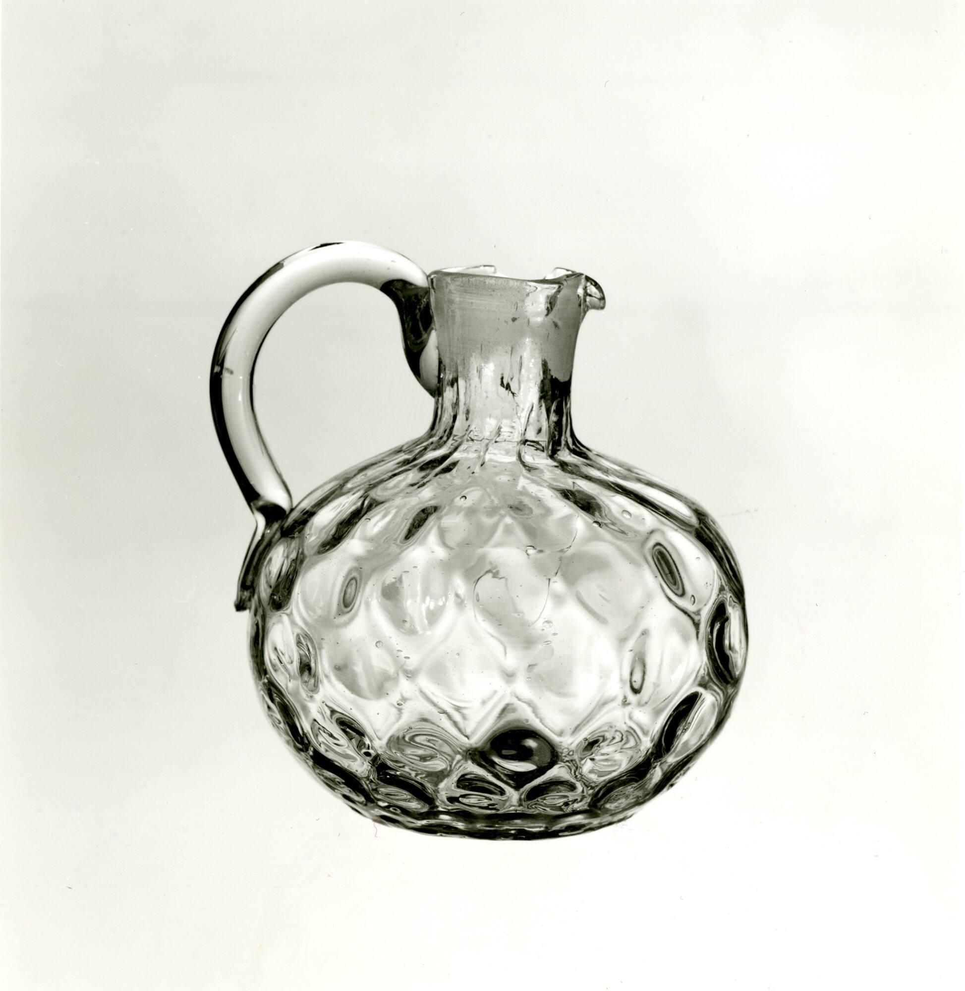 DescriptionExpanded and tooled to spherical form with cylindrical neck and small, tooled lip. Applied, tooled semi-ear-shaped handle. Rough pontil mark. Interior of neck rough ground to receive stopper. Colorless non-lead glass with a yellowish tint; blown and ball-optic-molded.
