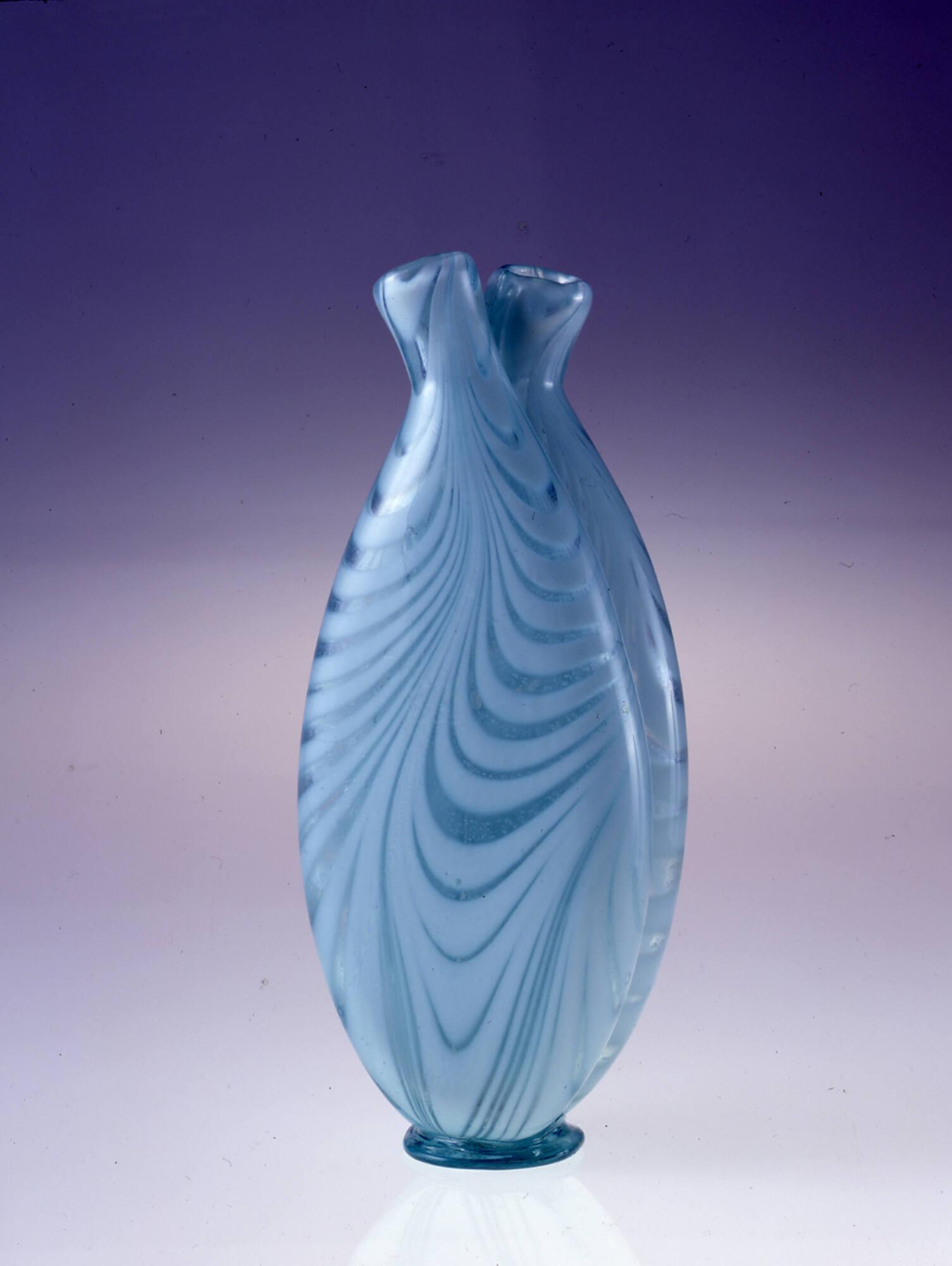 DescriptionTwo rather heavy gathers, each with applied opaque white trailings pulled up in a loop pattern. Blown and tooled to shape then stuck together and necks bent in opposite directions. Lips sheared and fire-polished. Rough pontil mark. Light aqua glass, slight lead content.