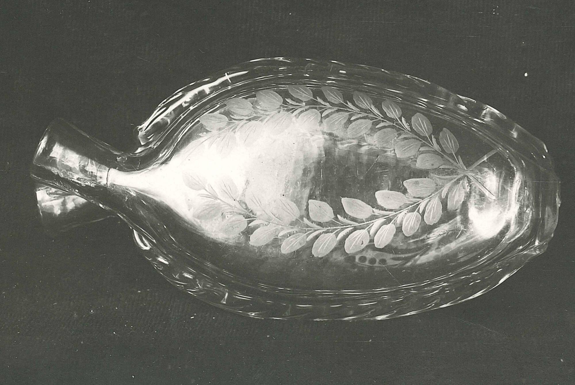 DescriptionTwo bottles blown and tooled, then reheated and joined. The side joints are covered with a leaflike band of tooled glass. Rough pontil mark. On the obverse: the monogram CD surrounded by two sprays of leaves and berries; on the reverse: a simpler wreath of leaves, engraved. Colorless glass.