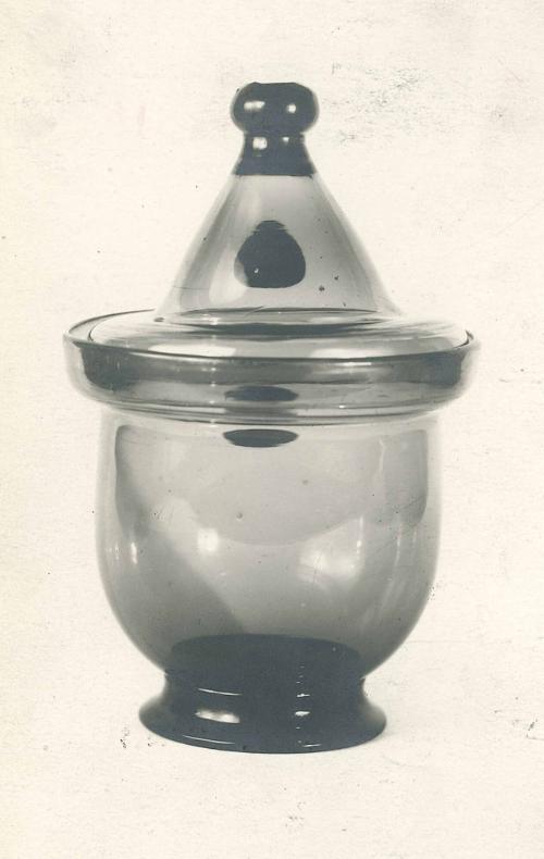 DescriptionDeep sapphire-blue lead glass. Body: blown and tooled to ovoid form with galleried rim. Applied tooled foot. Cover: blown and finished by tooling, with a solid finial and a flat shoulder terminating in a flanged, or reverse, galleried rim that fits within the gallery of the bowl. Lead glass; blown and tooled, applied foot.