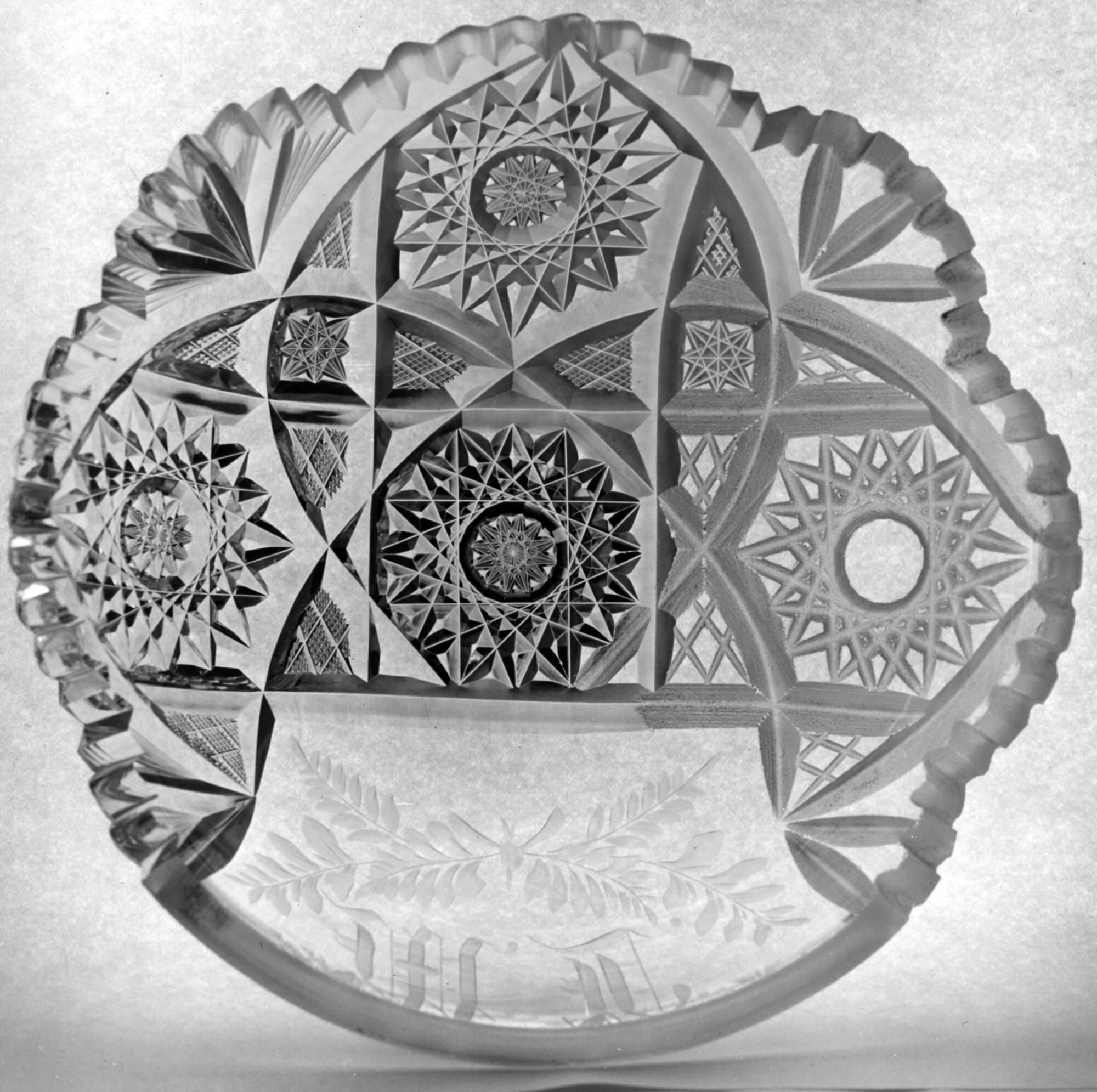 Label TextThis demonstration piece illustrates three stages of the glass-cutting process. The first panel shows the rough-cut basic pattern. In the next panel, the detail of the design has been added. Finally, the completed pattern, known as Sultana, is seen fully polished. The fourth panel illustrates engraving, a technique for creating decoration of pictorial designs and lettering.Published ReferencesLibbey Trade Catalog, Toledo Museum of Art Archives10 and AR-12, n.d. (1901-1902), p. 13, middle right, no. 36 (7-in. plate, Sultana).