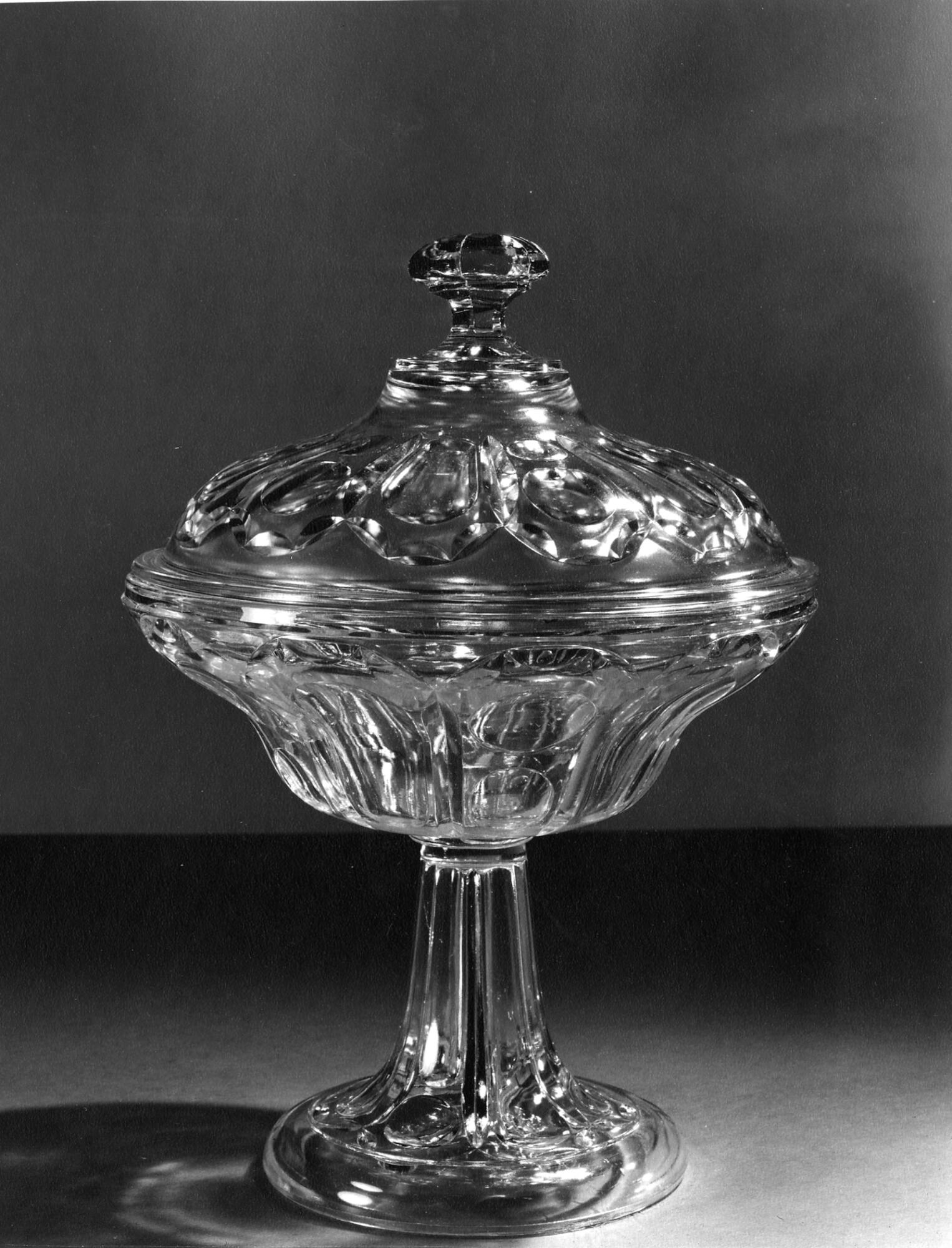 DescriptionCompote: bowl pressed, probably upright, in a one-piece female mold bearing the Washington pattern by a plain male plunger. Joined by a wafer to a circular stem and foot. Base pressed upside down in a one-piece plain female mold by a male plunger bearing the Washington pattern. Rim lightly fire-polished. No pontil mark. Cover: pressed upside down in a one-piece female mold bearing the Washington pattern, in conjunction with a two-piece female mold that formed the finial, by a plain male plunger.