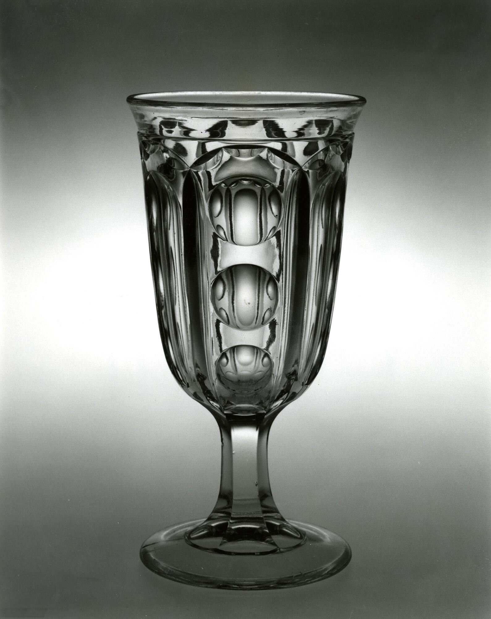 DescriptionPressed in a female mold of three vertical sections bearing the Washington pattern, with a one-piece cap ring that formed the area above each arch and the rim, by a plain male plunger that formed the interior of the bowl, in conjunction with a plain male plunger, or plug, that formed the plain underside of the slightly domed foot. The moldmarks extend from the middle edge of the foot through the edge of the hexagonal stem upward in the bottom of the V-shaped wedge between the flute and the three printies, ending at the top of the wedge. Rim slightly everted by tooling. No pontil mark.