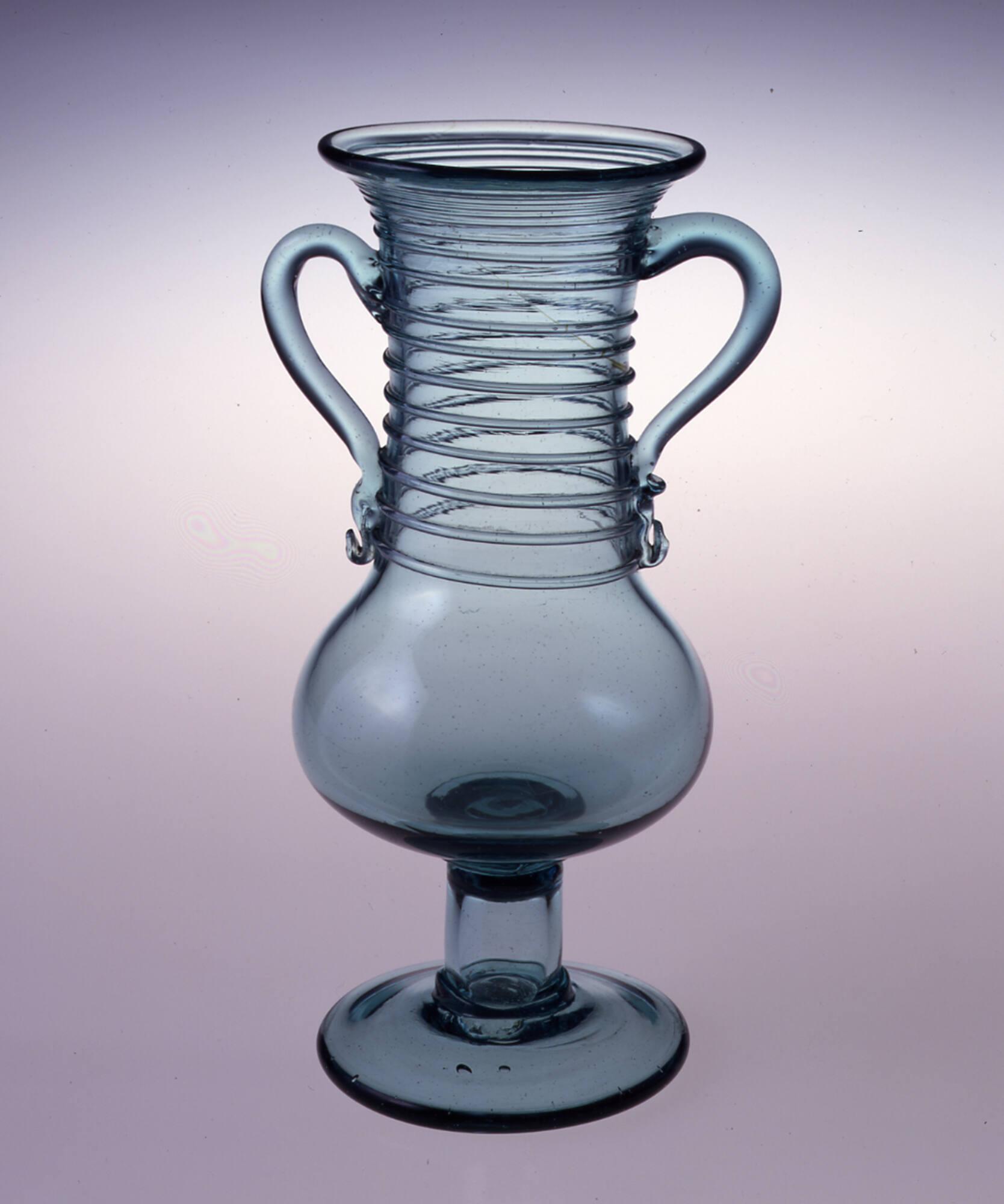 DescriptionBlown and tooled to shape. Applied thread around neck and under lip. Two applied handles with upturned lower ends, crimped. Hollow cylindrical stem joined by a wafer to the bowl. Applied slightly sloping foot. Rough, open pontil mark.