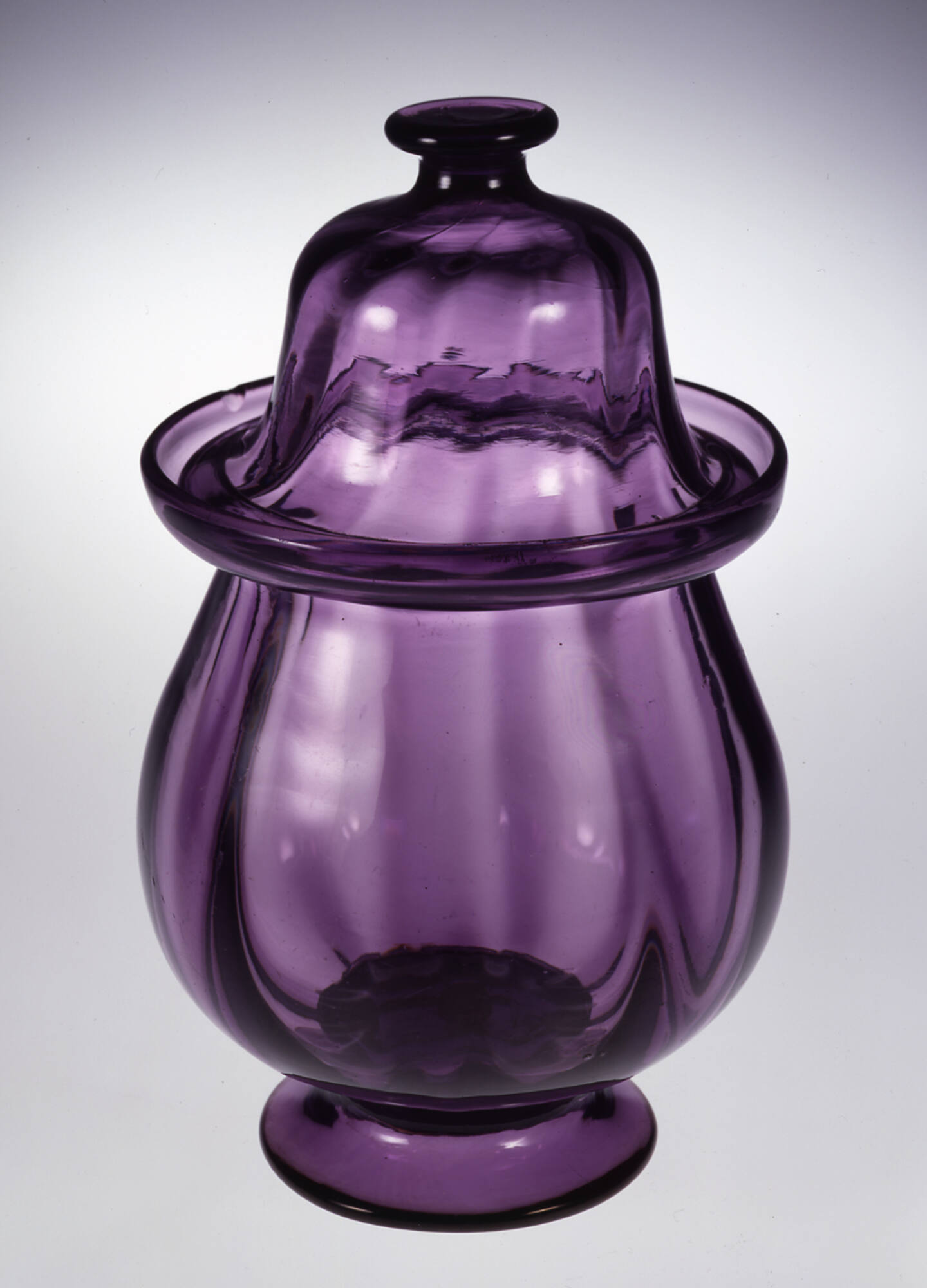 DescriptionBowl: blown in a one-piece dip mold patterned with 8 vertical ribs. Expanded and finished by tooling. Cover: blown in a one-piece mold patterned with 12 vertical ribs. Expanded and finished by tooling. Inward-folded rim. Sloping foot applied and finished by tooling. Rough, solid pontil mark.