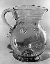DescriptionBlown and tooled to shape. Six applied Type II lily pads. Applied thread around neck. Applied solid upturned ear-shaped handle with upturned lower end with two curved crimps above end. Applied solid sloping foot. Rough, open pontil mark with circular black iron oxide deposit.