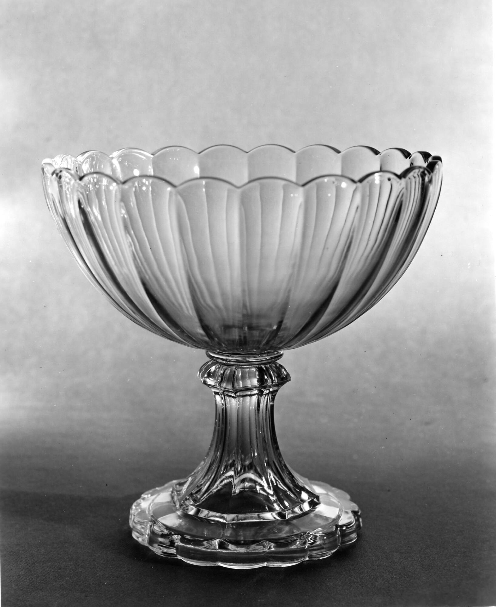 DescriptionBowl pressed upright in a one-piece female mold bearing the Huber pattern, 22 flutes, probably with a cap ring that formed the upper edge of the rim, by a plain male plunger. Joined by a wafer to an octagonal stem and scalloped foot. Base pressed upside down in a female mold of two vertical sections by a male plunger. Rim heavily fire-polished. No pontil mark.