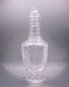 MediumColorless glass. Decanter: body blown in a mold and finished by tooling. Applied tooled foot. Hollow stopper: probably blown and finished by tooling. Applied tooled finial.