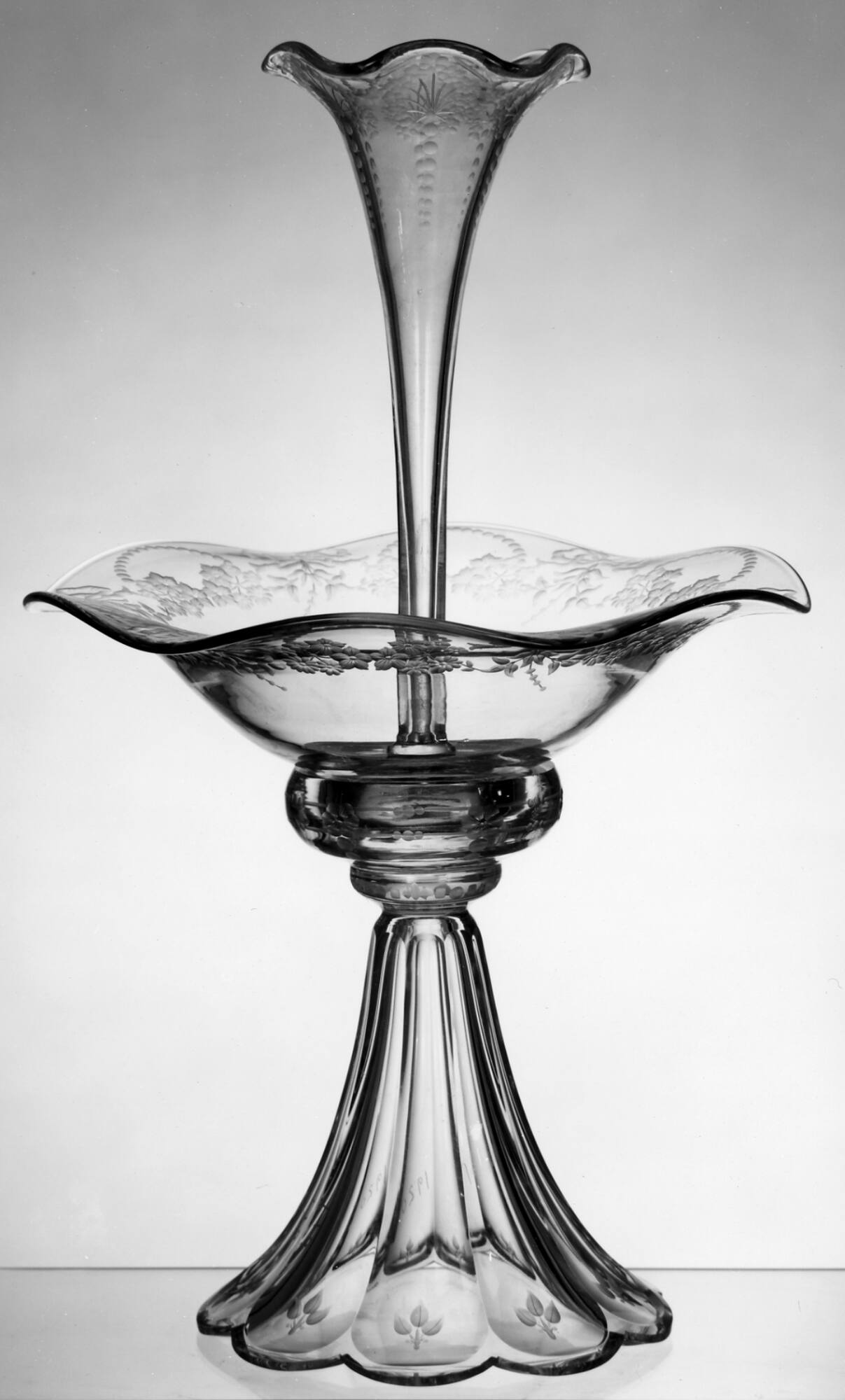 DescriptionBowl and flower holder: both blown and finished by tooling. Holder joined while hot to interior of bowl. Base: blown and finished by tooling; upper section joined to petaled lower section by a wafer. Exterior of flower holder engraved with a floral-and-geometric pattern; exterior of bowl engraved with a floral pattern. Edge of base cut with nine scallops, each engraved with a floret.
