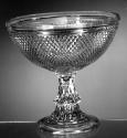 DescriptionBowl pressed, probably upright, in a one-piece female mold bearing the Sharp Diamond pattern, with a cap ring that formed the edge and top of the rim, by a plain male plunger. Joined by a wafer to a hexagonal standard and round foot. Base pressed upside down in a female mold of two vertical sections that formed the standard and circular disk at its base, in conjunction with a one-piece female mold that formed the sloping circular foot, by a plain male plunger that formed the hollow interior and underside of the foot. Rim fire-polished. No pontil mark.