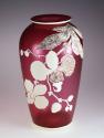DescriptionBlown and finished by tooling. Deep, concave, semipolished pontil mark. After annealing, the vase was cameo-cut, engraved, and acid-etched on one side with vines, leaves, and orchid blossoms. Most of the ruby background is a seminatural or semipolished surface showing evidence of wheel cutting. The surface of white blossoms, etc., is a natural-glass finish with ruby veins of leaves and blossoms a matte finish. Upper and lower sides of lip and scalloped band immediately below acid-matte finish; underside of base and scalloped band above it acid-matte finish, with spandrels between the scallops natural-glass finish.