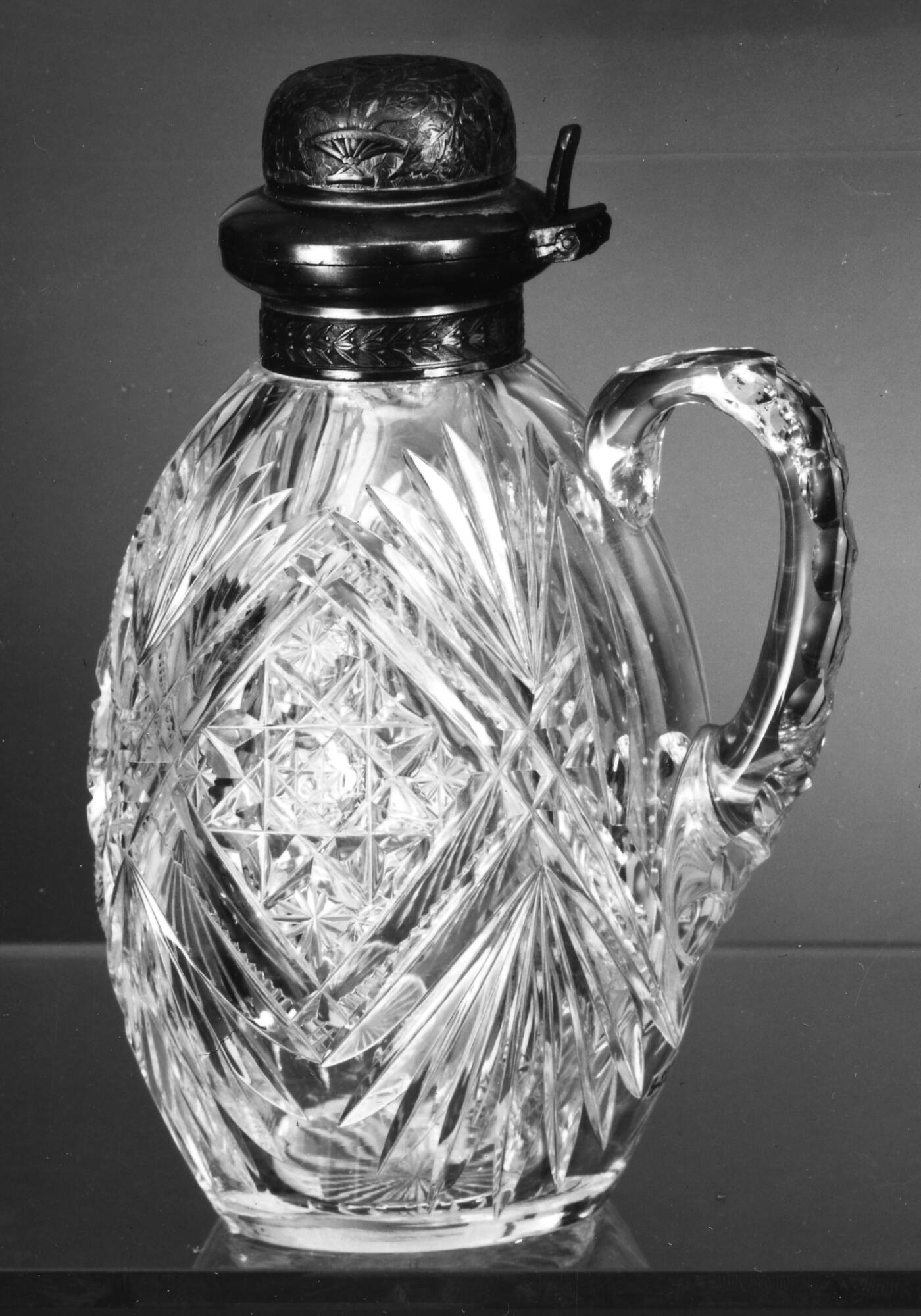DescriptionCut with the Victoria pattern. Exterior of handle facet-cut. Underside of base cut with a twenty-four-pointed star. Silver-plated collar and hinged cap, unmarked.