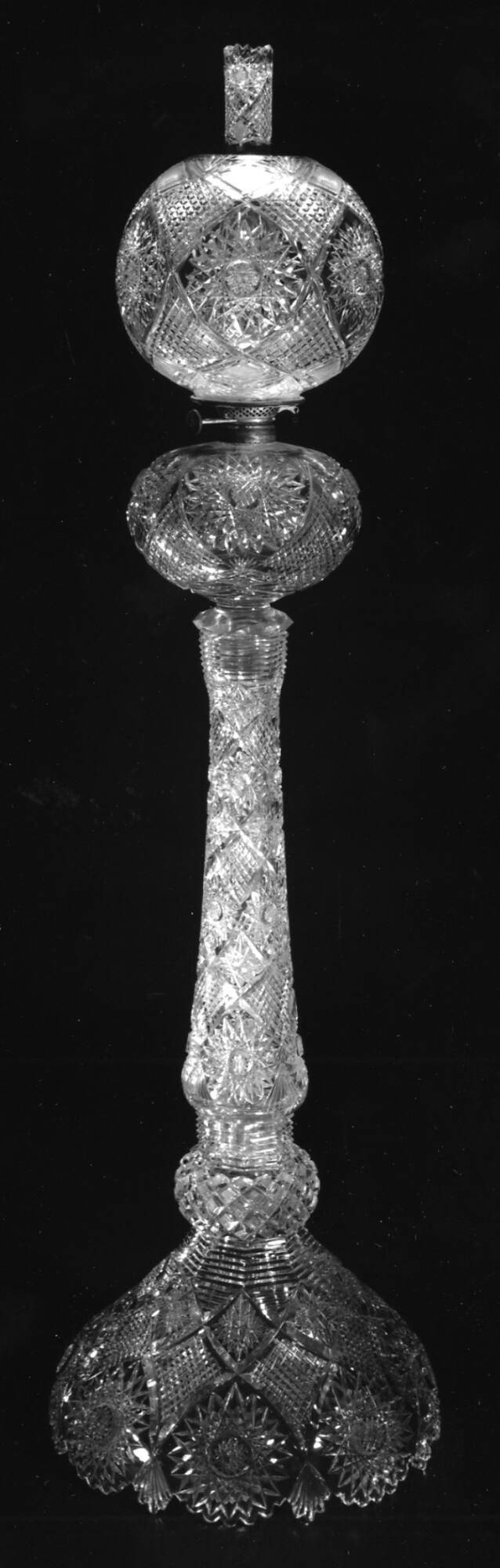 Label TextLike much of the Libbey cut glass in this gallery, this lamp and shorter the Banquet Lamp beside it were featured in the company’s display at the Louisiana Purchase Centennial Exposition in St. Louis in 1904. They each consist of five separately made parts: chimney, globe, font, standard, and base.Published ReferencesDaniel, Dorothy, Cut and Engraved Glass, 1771-1905, New York, M. Barrows, 1950, pp. 279-282 (pattern).