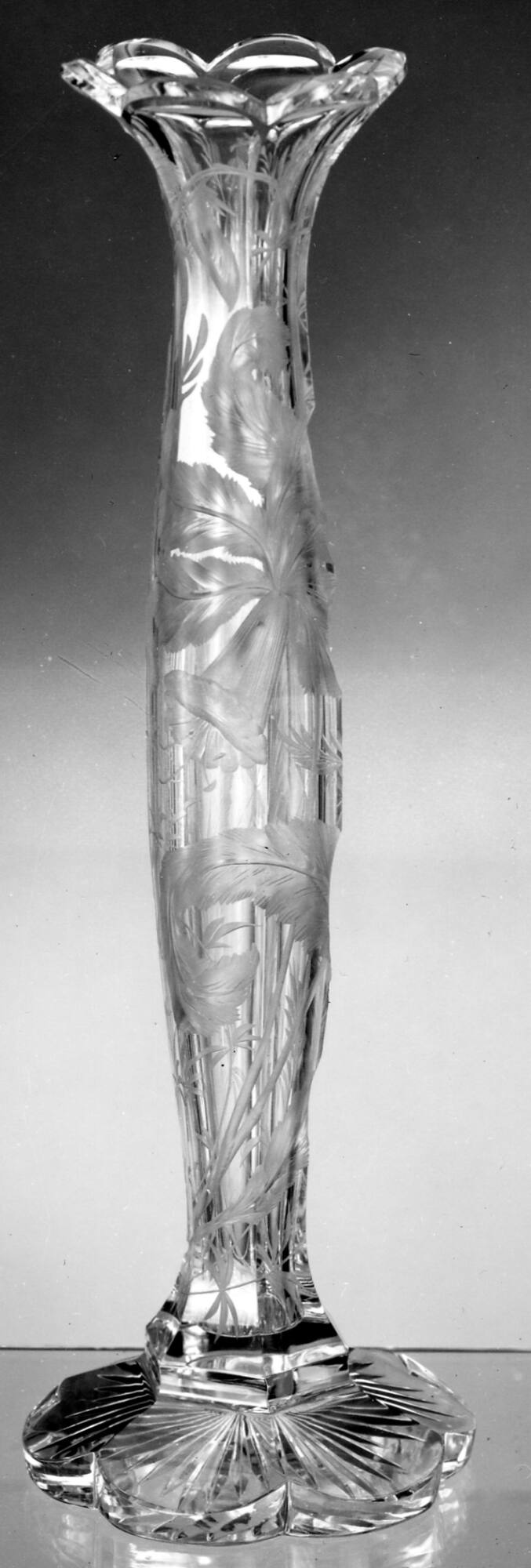DescriptionLibbey no. 701 vase. Blown, possibly in a mold, and finished by tooling. Applied tooled foot. Cut with Libbey Flute pattern. Intaglio-engraved with stone wheels with a pattern of stylized orchids. Underside of six-lobed foot cut with a polished six-section star with thirty-six uneven points.
