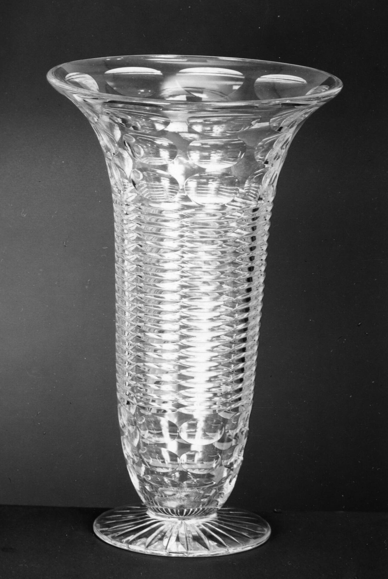 DescriptionPairpoint no. 1062 vase. Cut with stone wheels with the Tyrone pattern. Underside of foot cut with a twenty-four-pointed star. All cutting polished.