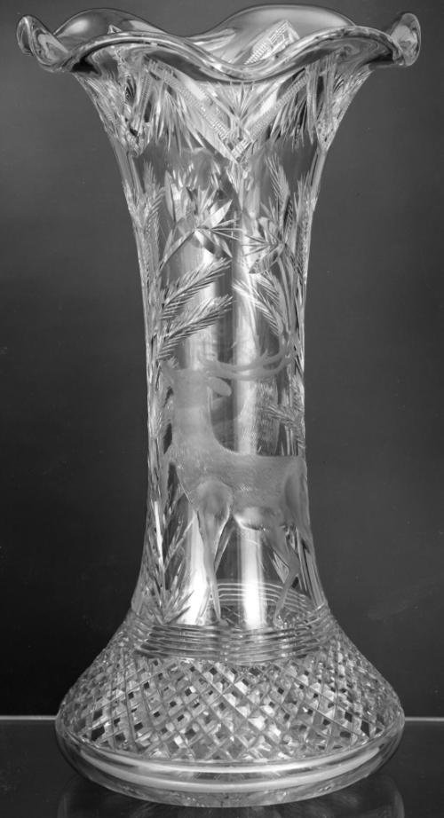 DescriptionLibbey no. 1119 vase. Blown, perhaps in a paste mold, and finished by tooling. Upper part of base cut with strawberry-diamond pattern. Cut with foliage on body and geometric motifs under rim. Engraved with two stags: Libbey pattern no. 387. One deer (with [sc]1915[r] below it) has polished engraving, the other deer is matte.