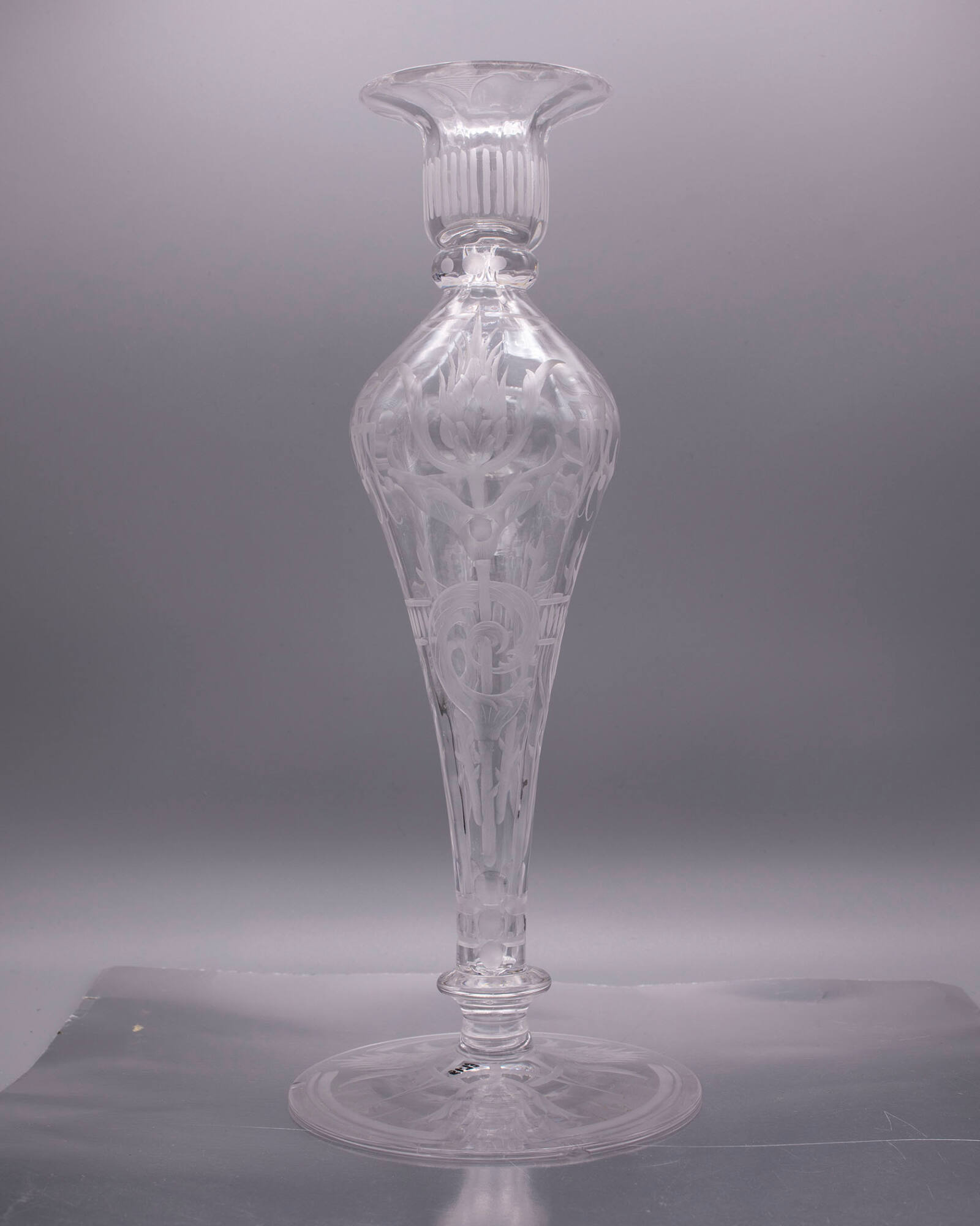 DescriptionLibbey no. 1080 10-inch candlestick. Socket and stem blown in optic molds with ten vertical ribs and finished by tooling. Joined by a solid knop. Joined by another knop to the tooled foot. Polished pontil mark. Standard engraved with stone wheels with three exotic flowers and geometric motifs, matte finish. Underside of foot engraved with the same three exotic flowers.