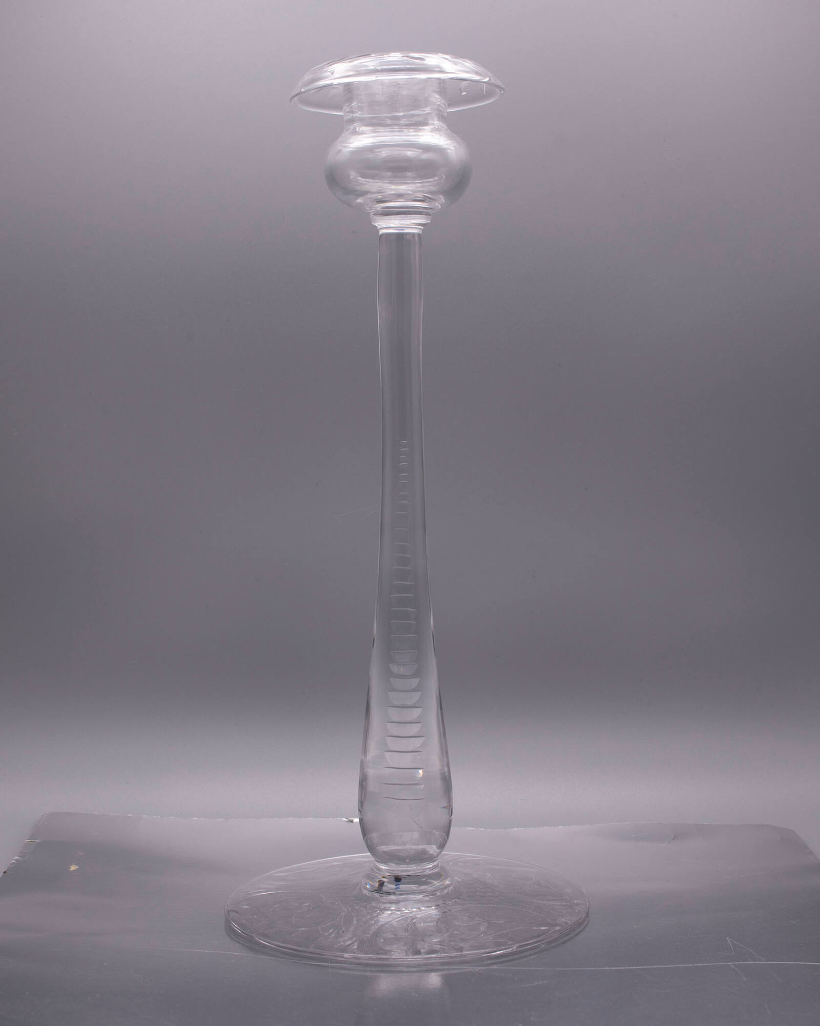 DescriptionMade and decorated in the same manner as 1951.76, but the socket rim and the underside of the foot are engraved with stylized leaf branches. Standard has three rows of slice cutting. All cutting and engraving polished.