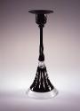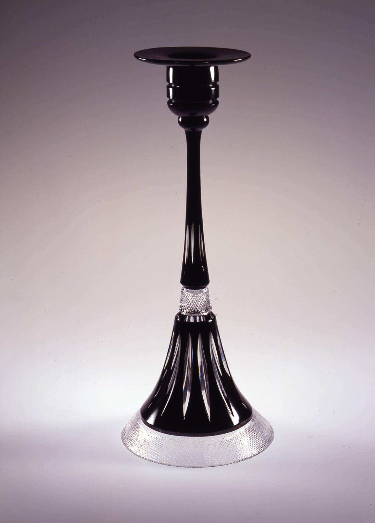 DescriptionBobeche and socket blown and finished by tooling. Joined by a bulbous knop to the solid tooled standard that was drawn from the blown and tooled base. Socket, standard, and base cut with geometric motifs with bands of cut diamonds at juncture of standard and base.