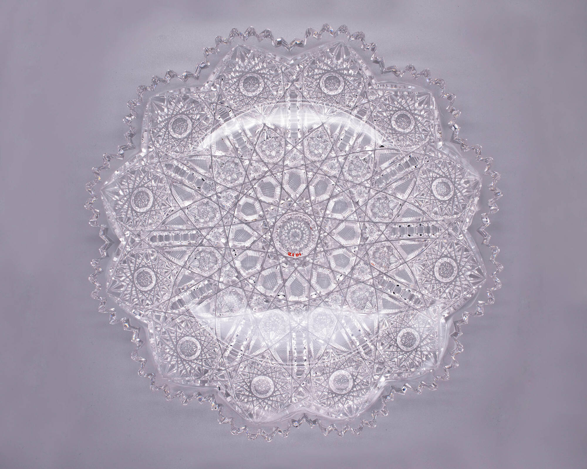 DescriptionBlank pressed. Cut with an intricate pattern of an unknown name: small hob star in center surrounded by concentric rings of cross-cut polygons, stars, cross-cut triangles, and hob stars.