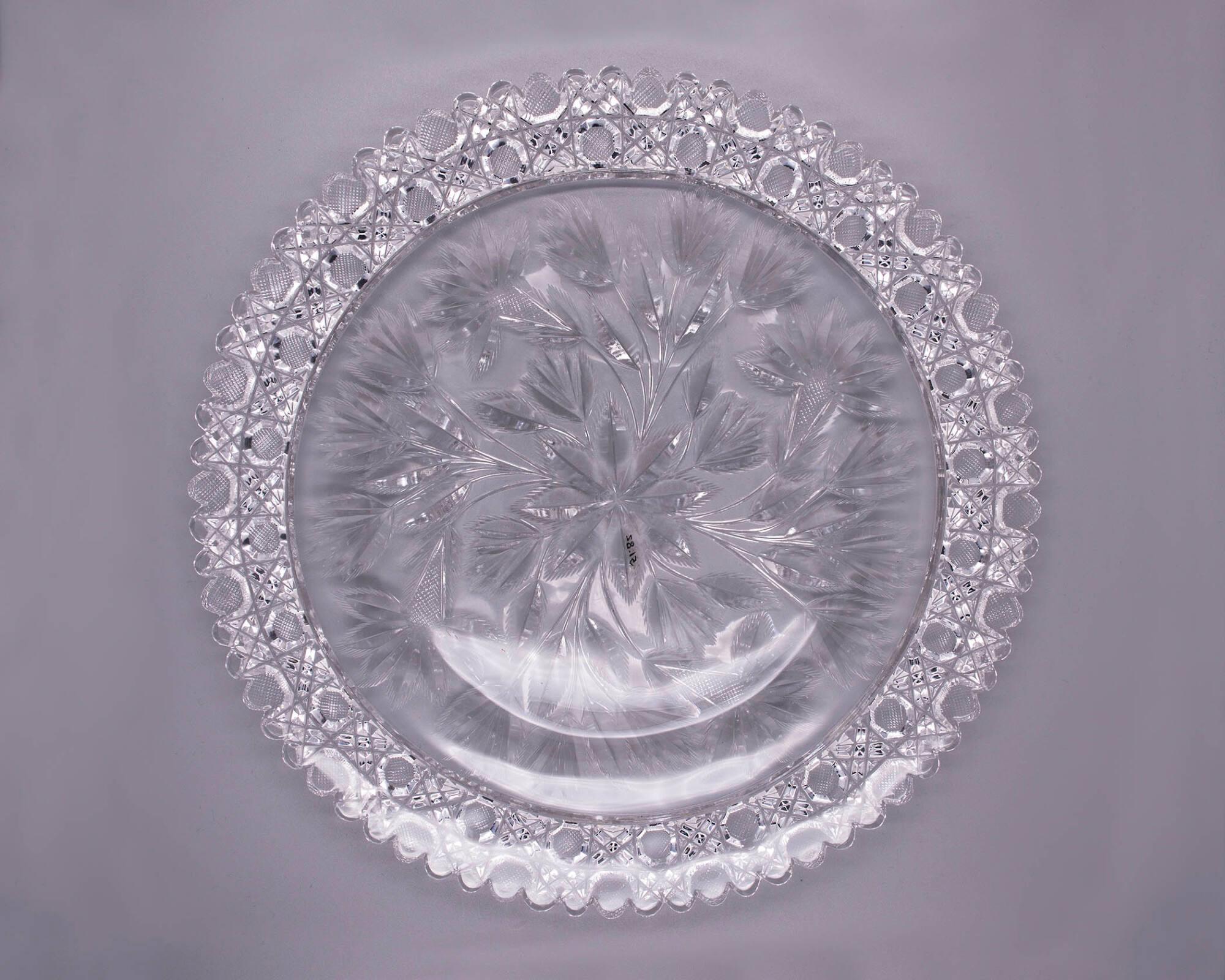 MediumColorless glass; blank pressed, probably in a patterned mold including the star flower in the center and the leaves, which were finished by cutting.