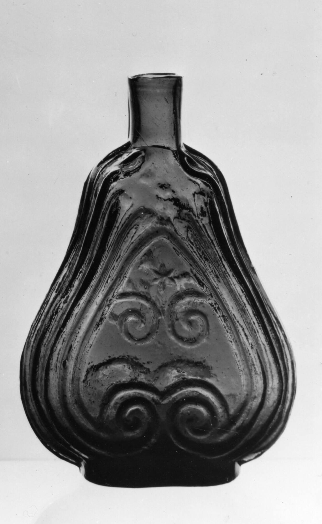DescriptionBlown in a full-size two-part mold (McKearin G.IX-10b) that formed body and base. On both sides: an inverted heart shape formed by scrolls, with a medium-size six-pointed star below a small six-pointed star. The base is plain except for a very faint moldmark and a heavy, rough, open pontil mark. Capacity: 1 pint.