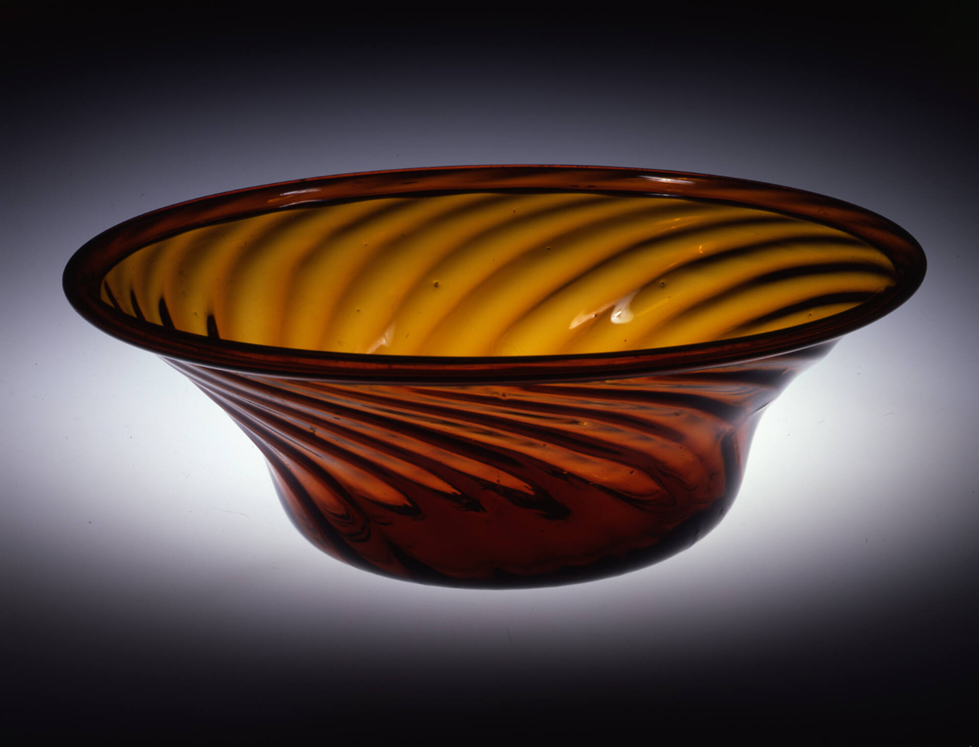 DescriptionBlown and patterned, probably in a dip mold with 20 vertical ribs. Removed and twisted to the left. Expanded and tooled to shape. Ribs extend almost to the center of the slightly concave base, where they are obliterated by a rough, irregular pontil mark. Rim folded outward.