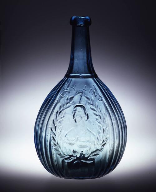 DescriptionBlown in a full-size mold (McKearin G.I-104) of two vertical sections and a base plate. On the obverse: a three-quarter profile bust of Jenny Lind almost surrounded by a laurel wreath. On the reverse: a glasshouse. Collar applied and tooled. The base is plain except for extensions of moldmarks in the basal ring; the slight kick-up is almost covered with a red iron oxide deposit left by the pontil. Capacity: 1 quart.