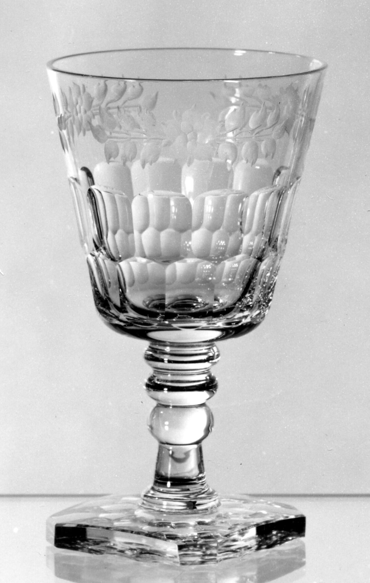 DescriptionSmall concave, polished pontil mark. Bowl cut with a geometric pattern and engraved above with three flowers with leaves, matte finish. Underside of foot cut with geometric pattern. Edges and sides of foot cut and polished.