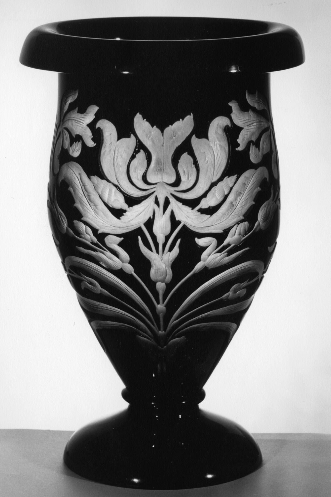 Label TextIn response to consumer demand, many stylistic changes took place in tablewares and accessories during the 1920s. Chief among them were the introduction on a large scale of colored glass and the transition from deeply cut and engraved wares to “light” cutting and engraving, as seen on this vase and others in this display case.Published ReferencesThe Toledo Museum of Art, Art in Glass: A Guide to the Glass Collections, Toledo, Ohio, 1969, repr. p. 121.