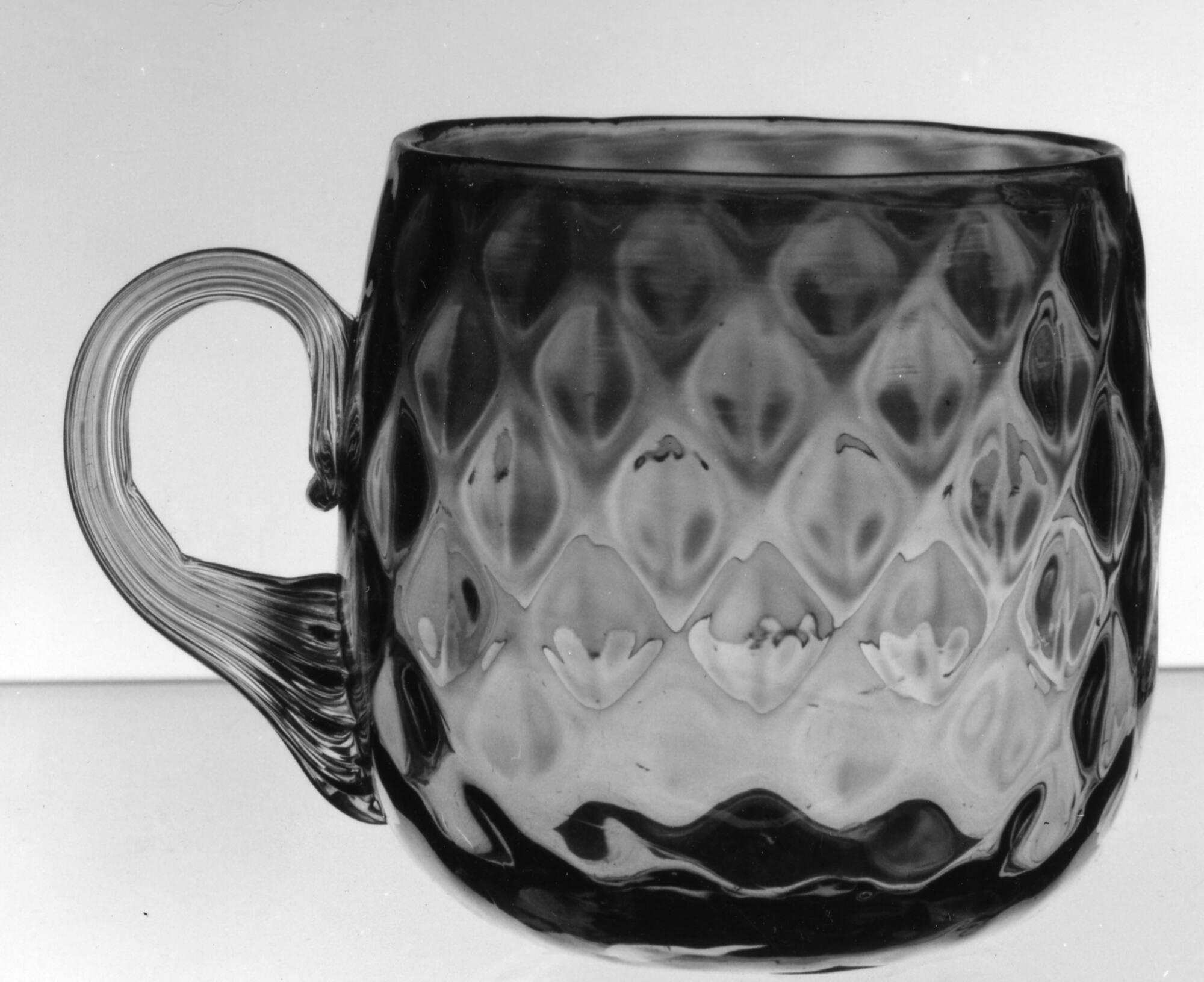 DescriptionBlown and optic-molded with a lozenge pattern, then finished by tooling. Applied ribbed, pattern-molded handle. Concave, polished pontil mark.