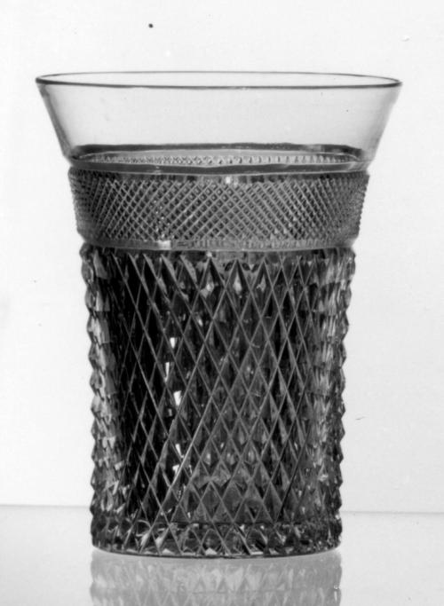 DescriptionBlank blown in a mold and finished by tooling. Cut with a band of strawberry diamonds and diamonds. Underside of base cut with a forty-eight-pointed star with uneven rays.