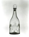 DescriptionVery short flanged lip. Neck of decanter rough ground to receive stopper. Rough pontil mark. Body engraved with stone wheels with a crudely formed American eagle. Flat, almost circular, stopper: formed in a plier press; end left unfinished. Shank ground to fit neck of a decanter.
