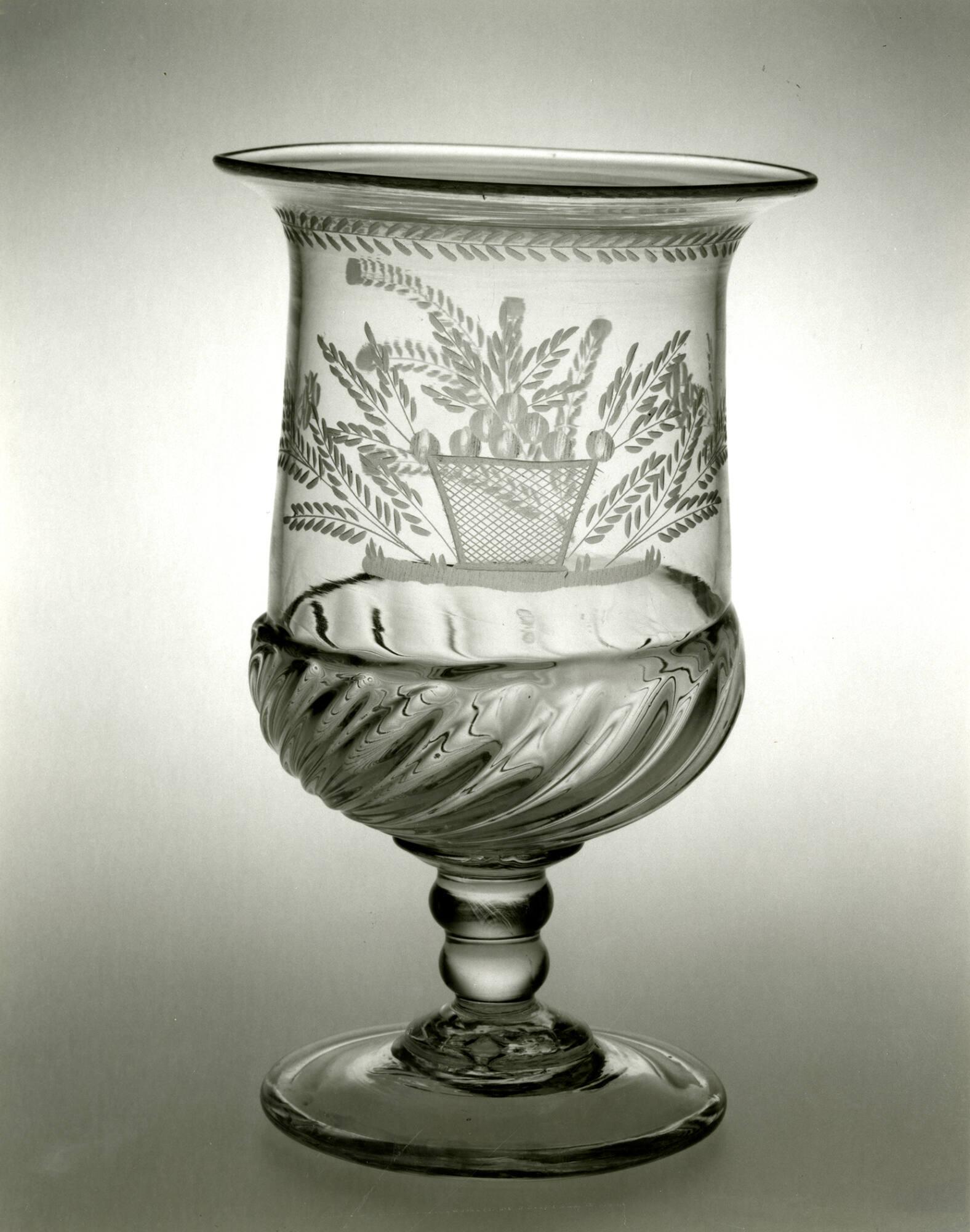DescriptionBowl blown and finished by tooling. Applied gather on the lower section patterned in a dip mold with twenty flutes to produce gadrooning swirled to the right. Joined by a double-knopped stem to a double-domed circular foot tooled from a second applied gather. Rough, open pontil mark. Bowl engraved with copper wheels with a basket of flowers and leaf sprays on the obverse, a spray of leaves on the reverse.