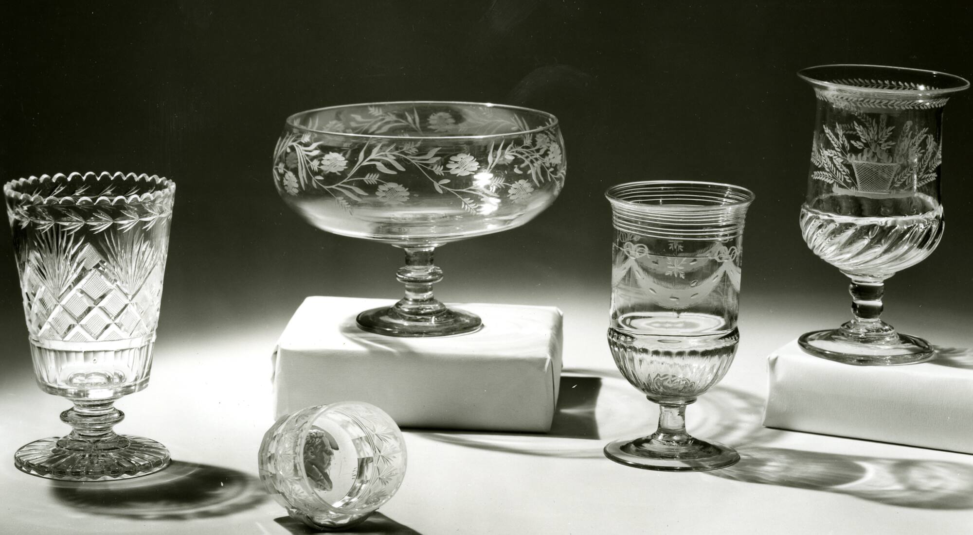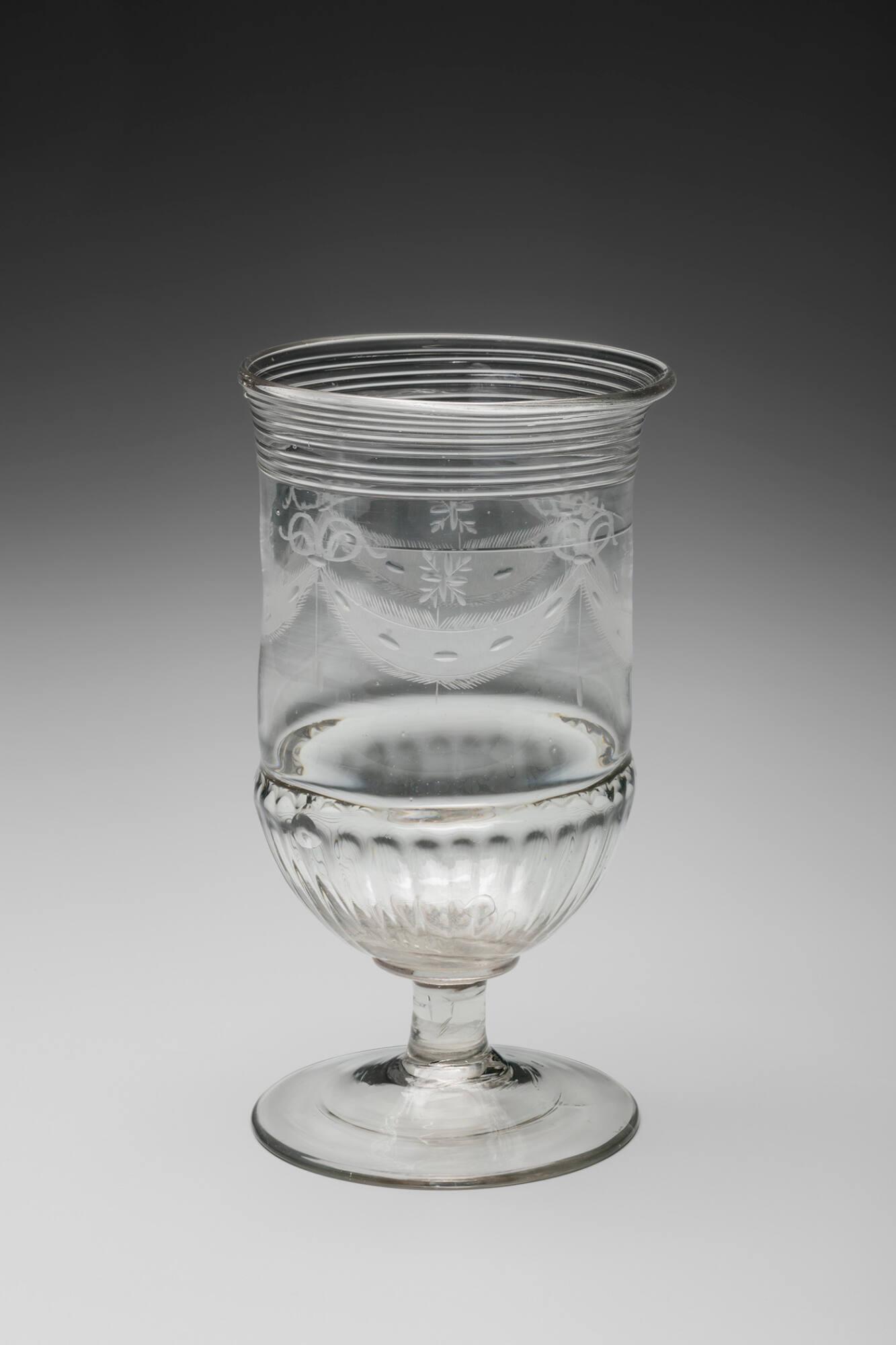 DescriptionBowl blown and finished by tooling. Superimposed gather around the lower section patterned in a dip mold with 32 flutes to produce gadrooning. Joined by a wafer and a short cylindrical stem to a slightly domed circular foot tooled from a third applied gather. Rough, open pontil mark. Bowl copper-wheel-engraved with swags and festoons.