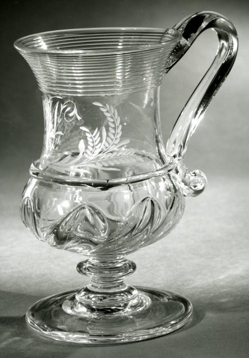 Label TextNew England Glass Company, East Cambridge, Massachusetts Footed Mug Colorless glass, blown and engraved, about 1835-40 (probably engraved 1842) Purchased with Funds from the Libbey Foundation, Gift of Edward Drummond Libbey, 1959.48Published ReferencesMcKearin, George S. and Helen McKearin, drawings by James L. McCreery, American Glass, New York, Crown, 1941; rev. ed., 1948, p. 160, repr. pl. 55, no. 6.