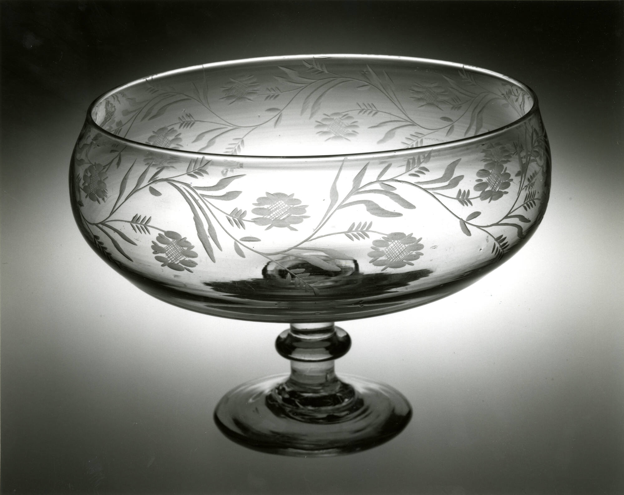 DescriptionJoined by an applied stem with medial knop to a circular two-step foot made from two applied and tooled gathers. Rough, solid pontil mark. Bowl sketchily engraved with a meandering band of flowers and leaves.