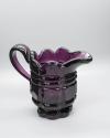 DescriptionDeep amethyst glass. Body and sides of foot pressed upright in a female mold of four vertical sections, with a base plate bearing a twelve-pointed star that formed the underside of the base, with a cap ring that formed the rim, by a plain male plunger. Four mold seams rise vertically from the lower edge of the foot to the rim, one on each side of the spout, the other two on each side of the handle. Applied and tooled solid handle crimped at lower end. Rim fire-polished. Rough pontil mark.