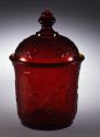 DescriptionBowl: pressed upright in a female mold of three vertical sections bearing the so-called ivy-in-snow pattern, with a base plate bearing a pattern of twenty pointed rays that formed the base, with a cap ring that formed the upper edge and top of the rim, by a plain male plunger. The moldmarks extend from the bottom edge of the base to the rim. No pontil mark. Cover: pressed, probably upside down, in a one-piece female mold bearing the pattern, in conjunction with a two-piece female mold that formed the finial and a one-piece female mold that formed its top, with a cap ring that formed the rim, by a plain male plunger. No fire-polishing. No pontil mark.