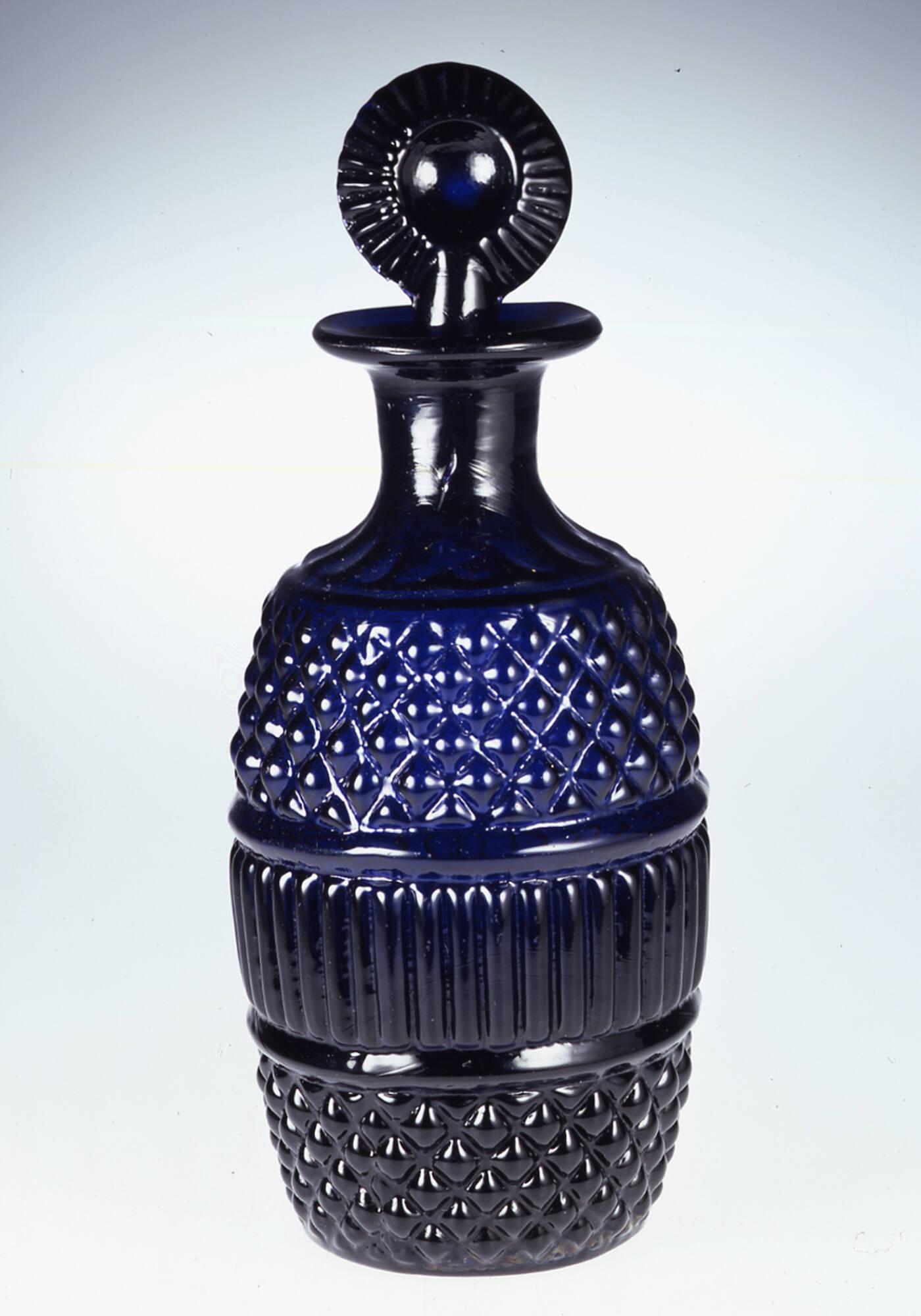 DescriptionDecanter: blown in a mold (McKearin G.II-7) of three vertical sections and a plain base plate. Neck and lip sheared and tooled to shape. Interior of neck rough-ground to receive stopper. Small, rough, solid pontil mark. Capacity: 1 pint. Wheel stopper (McKearin no. 21): pressed.