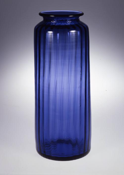 DescriptionBlown and patterned in a one-piece dip mold with twenty-four ribs, then optic-molded while being expanded and turned in a smooth, cylindrical paste mold, and finished by tooling. The outer underside of the base varies in width from about 0.9 cm (3/8 in.) to 1.9 cm (3/4 in.) and has been ground flat and polished. No pontil mark. The external ribs formed in the dip mold are evident on the short neck, in contrast to the optic-molded areas on the body and shoulder.