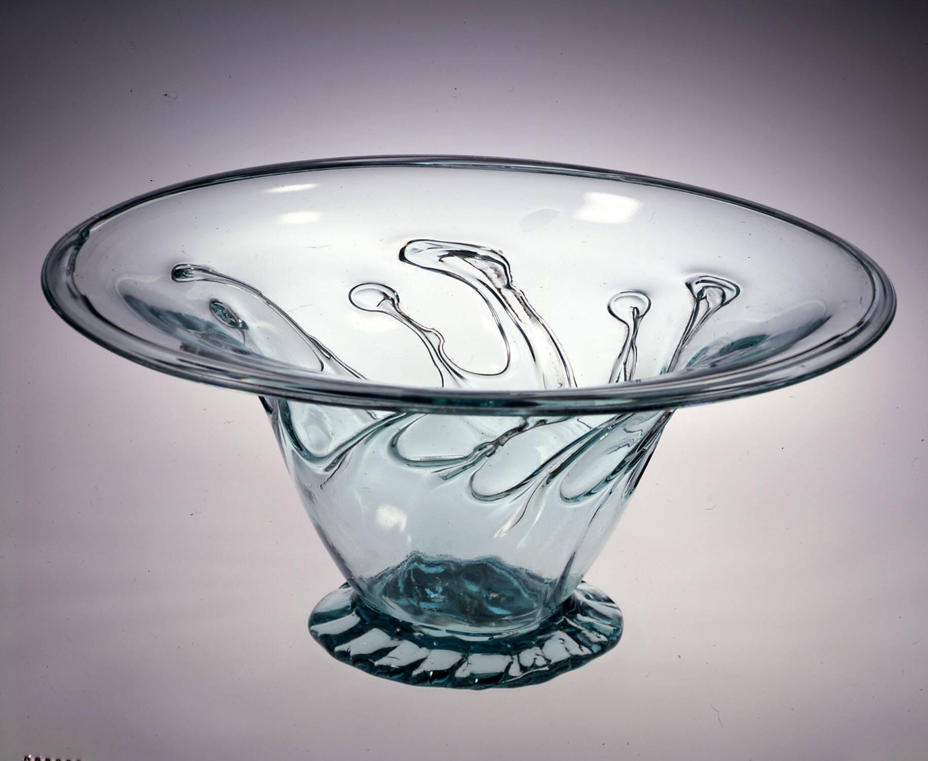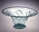 Label TextOne of the most visually satisfying—and enigmatic— types of early American decorated glass, “lily pad” vessels were blown of unrefined window or bottle glass. The design got its nickname because the applied outer layer of glass has been tooled and shaped into irregular peaks finished with a blob or pad of glass resembling the water plants. For this bowl, the glassblower crimped the foot, thereby reinforcing the sense of movement created by the lily pads. The tooled “tentacles” of glass extend nearly to the rim, and when viewed from the top, form an especially dynamic design.Published ReferencesMcKearin, George S. and Helen McKearin, drawings by James L. McCreery, American Glass, New York, Crown, 1941; rev. ed., 1948, p. 174, repr. pl. 64, no. 1.