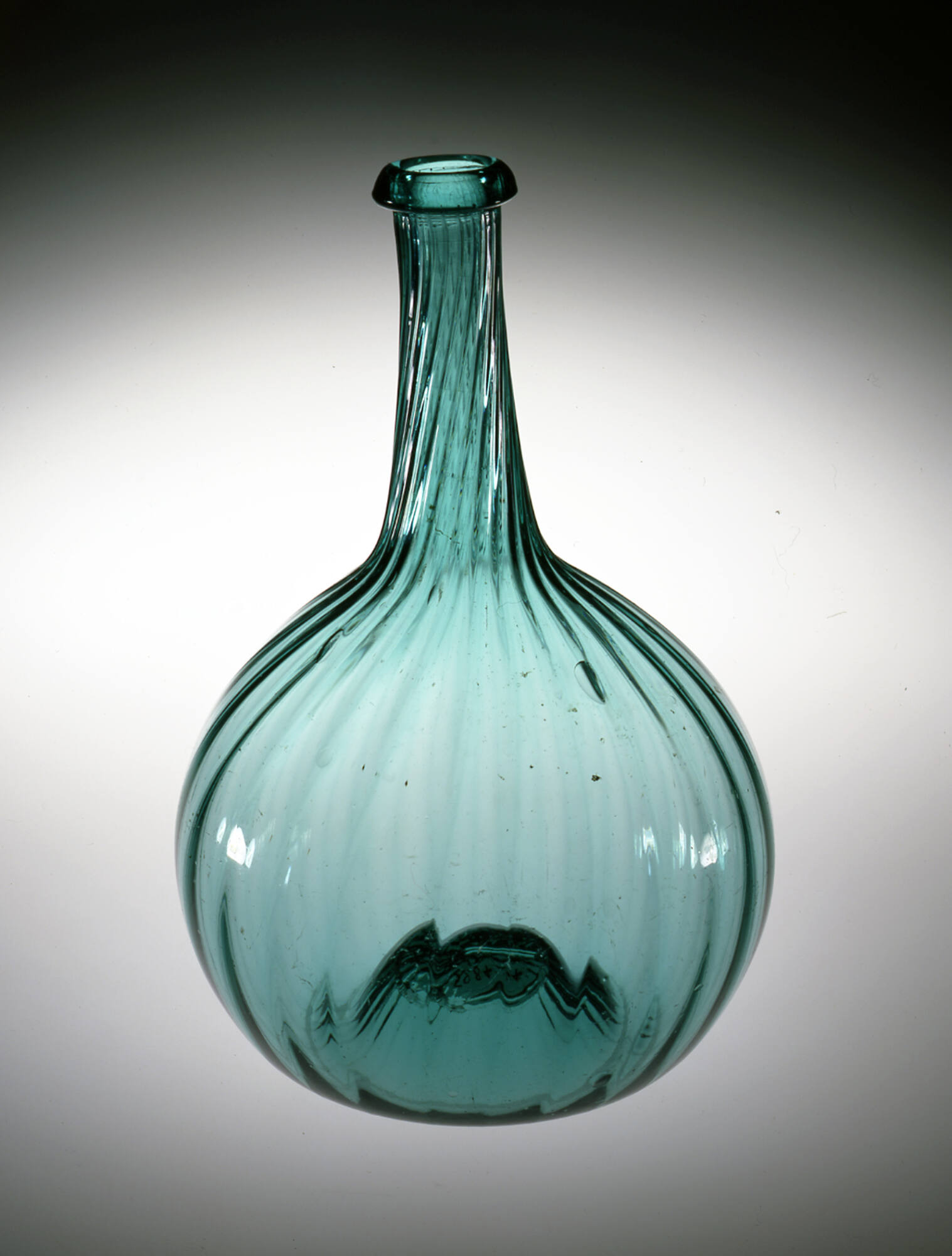 DescriptionBlown and patterned in a dip mold with 24 vertical ribs. Removed and twisted slightly to the right. Expanded and tooled to shape. The ribs extend onto the base and converge at its center. Folded collar tooled from the neck. Fairly high kick-up. Rough, open pontil mark. Capacity: about 1 quart.