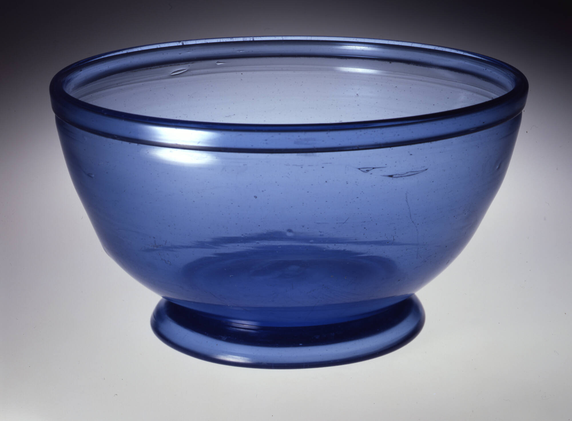 DescriptionBlown and finished by tooling. Outward-folded rim. Applied steeply sloping foot with tooled, domed underside. Rough, solid pontil mark.