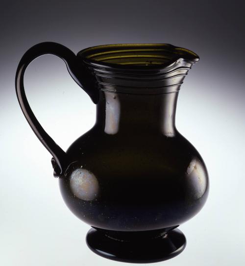 DescriptionBlown and tooled. Applied solid handle with upturned lower end. Applied circular foot. Applied thread around neck. Rough, open pontil mark.