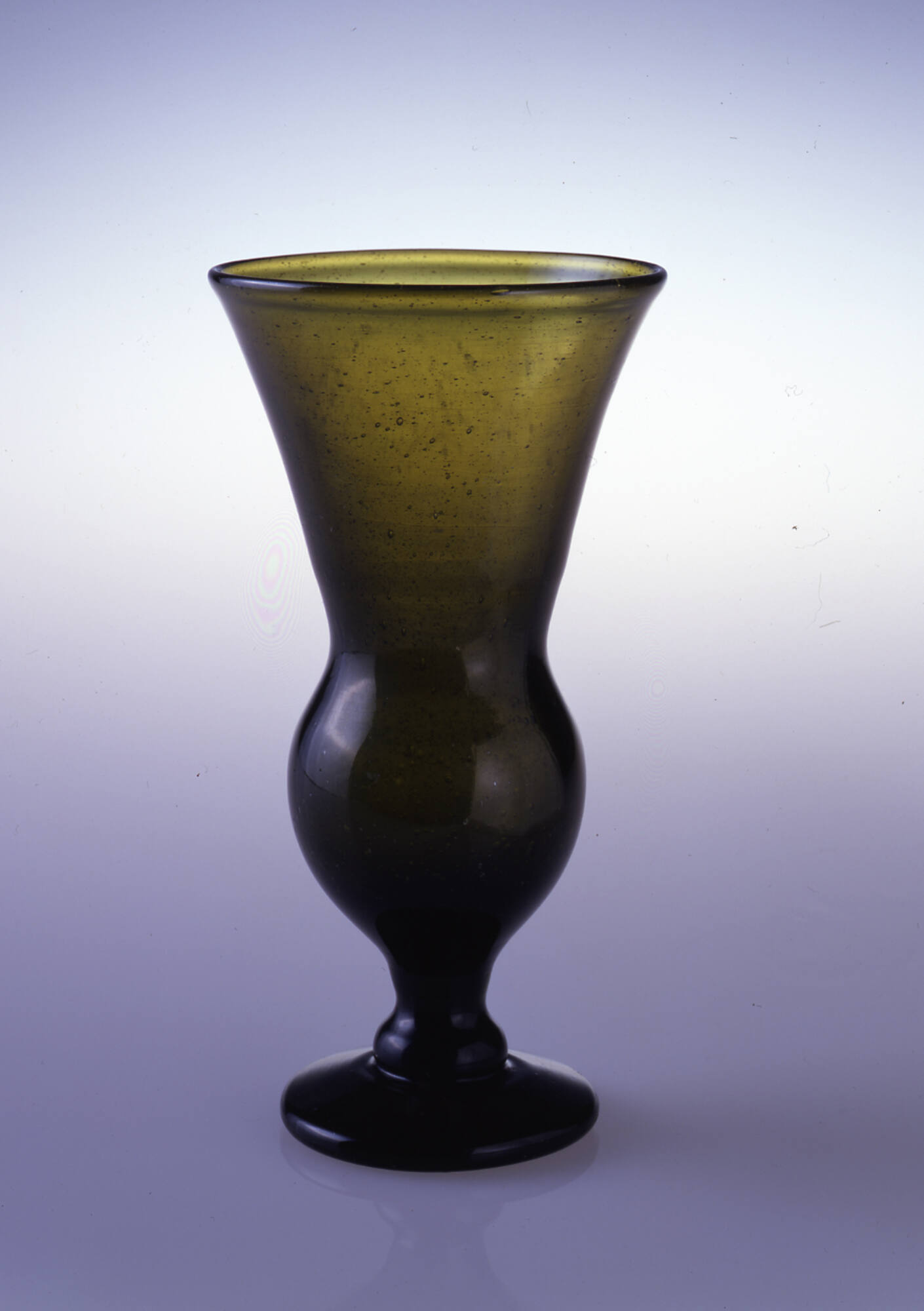 DescriptionBlown and tooled. Stem and knop above foot drawn from same gather. Applied slightly sloping foot. Rough, solid pontil mark.