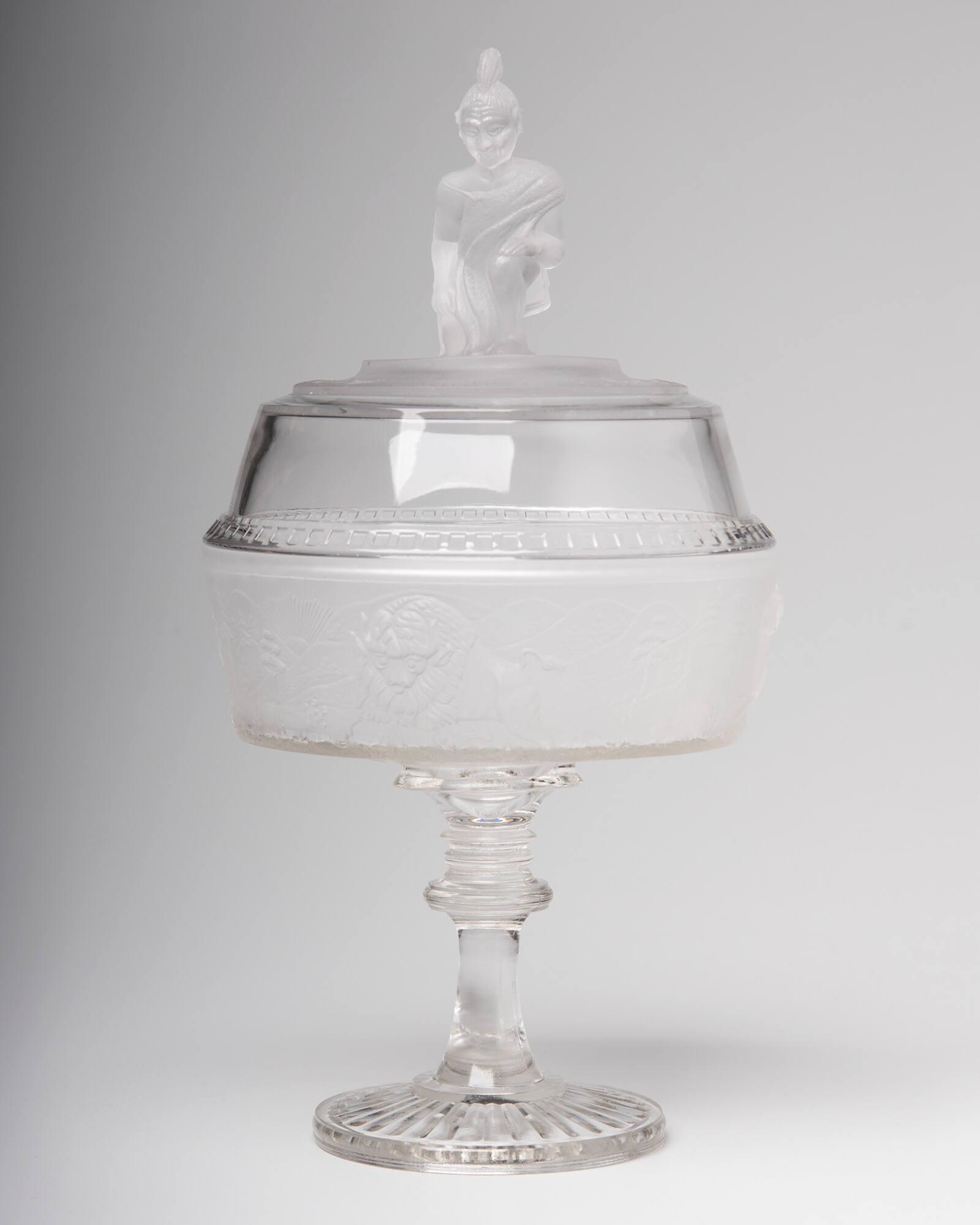 DescriptionCompote: pressed in the same manner and pattern and the same type of mold as 1961.45. Cover: pressed upside down in a one-piece mold that formed the exterior of the cover below the figure, in conjunction with a four-piece female mold that formed the Indian finial, by a plain male plunger. The moldmarks follow various complicated paths over the figure's anatomy. The Indian, the top of the cover, and the band on the compote were frosted by acid etching.