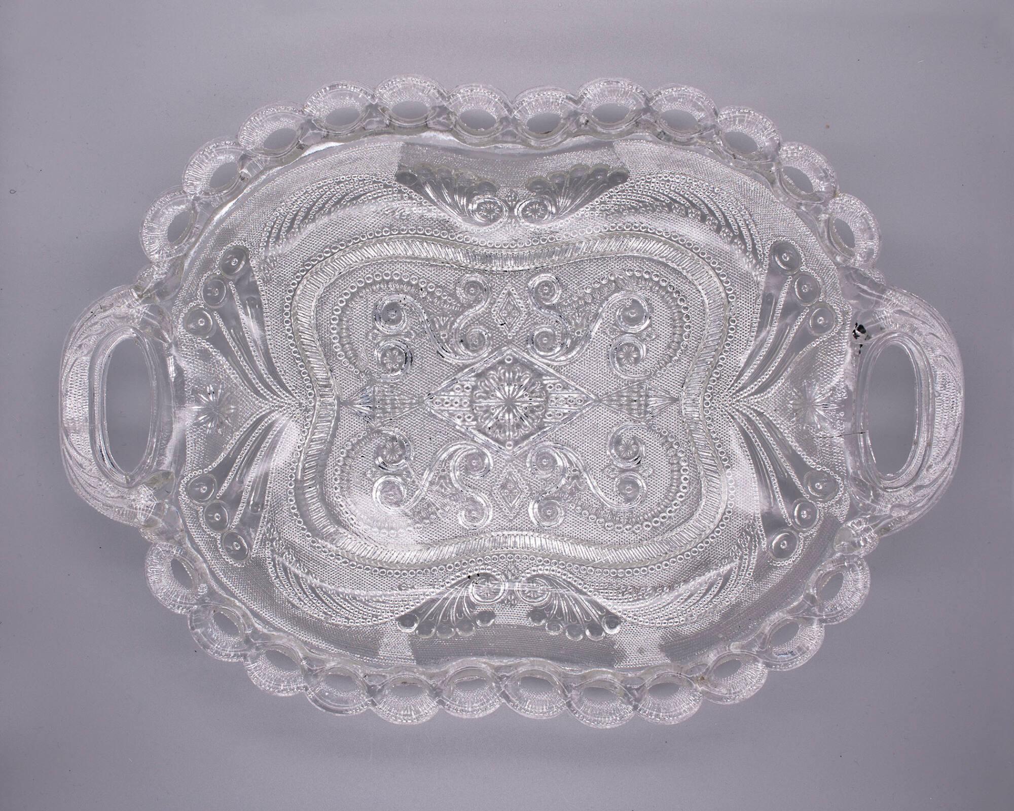 Label TextIn 1829 Deming Jarves of the Boston & Sandwich Glass Co. patented a process of pressing a patterned mold onto a sheet of soft glass that then slumped into a mold of the desired shape. This eliminated the necessity of costly molds for each shape and pattern. By 1830 there were presses that made it possible to press an open handle as an integral part of a pitcher. Within just a few years, a glassmaker succeeded in pressing this remarkable tray with its pierced rim and openwork handles.Published ReferencesLee, Ruth Webb, Sandwich Glass: The History of the Boston and Sandwich Glass Company, 7th ed., Northboro, Mass., author, 1947, pp. 416-417, pl. 163.
