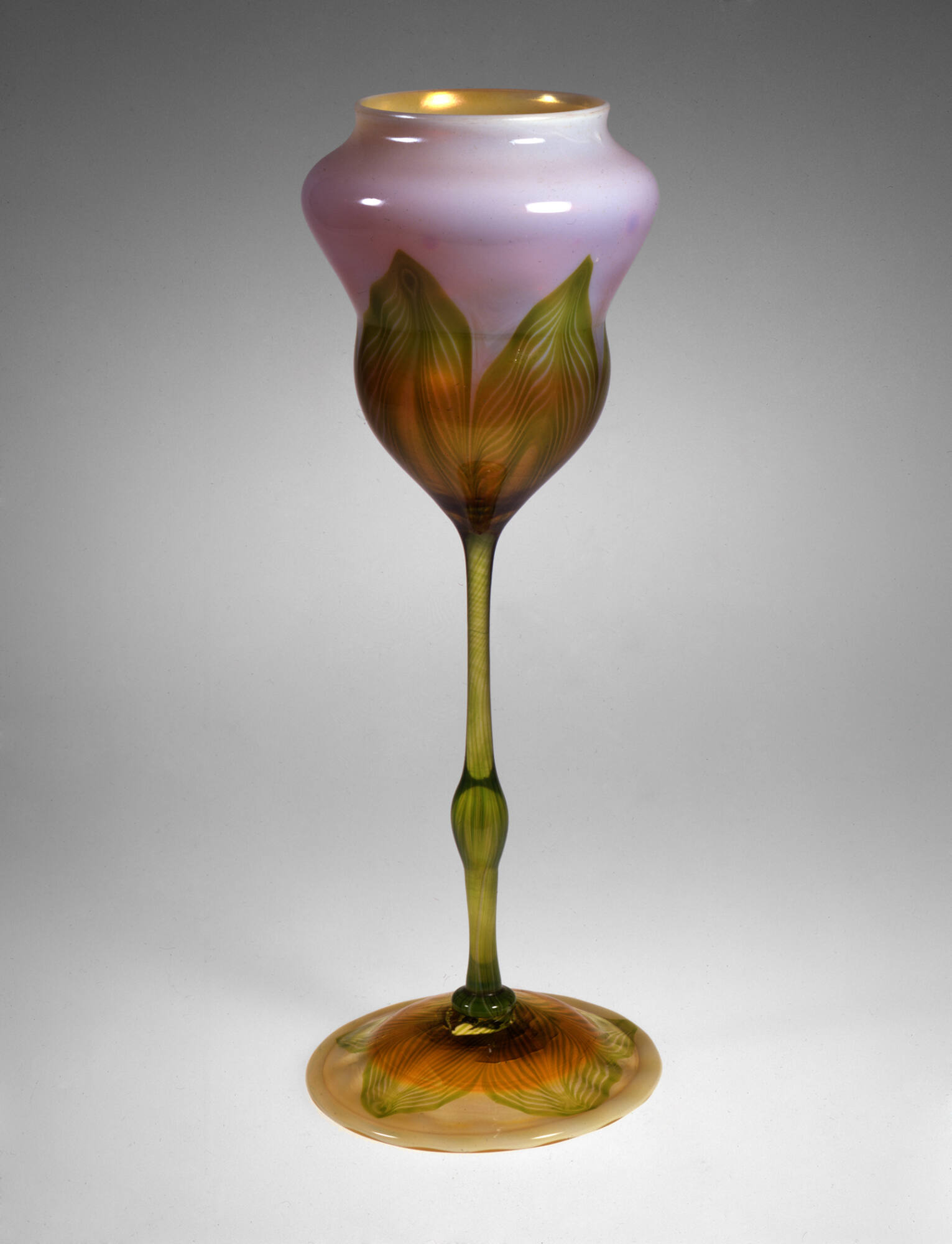 DescriptionPinkish opaque-opalescent white-and-pale-green glass. Blown and finished by tooling, then decorated with applied green glass tooled leaves. Applied stem, decorated with applied green-and-white glass. Applied foot, decorated with applied green glass leaf tooled decoration. Rim of foot folded under. Rough pontil mark.