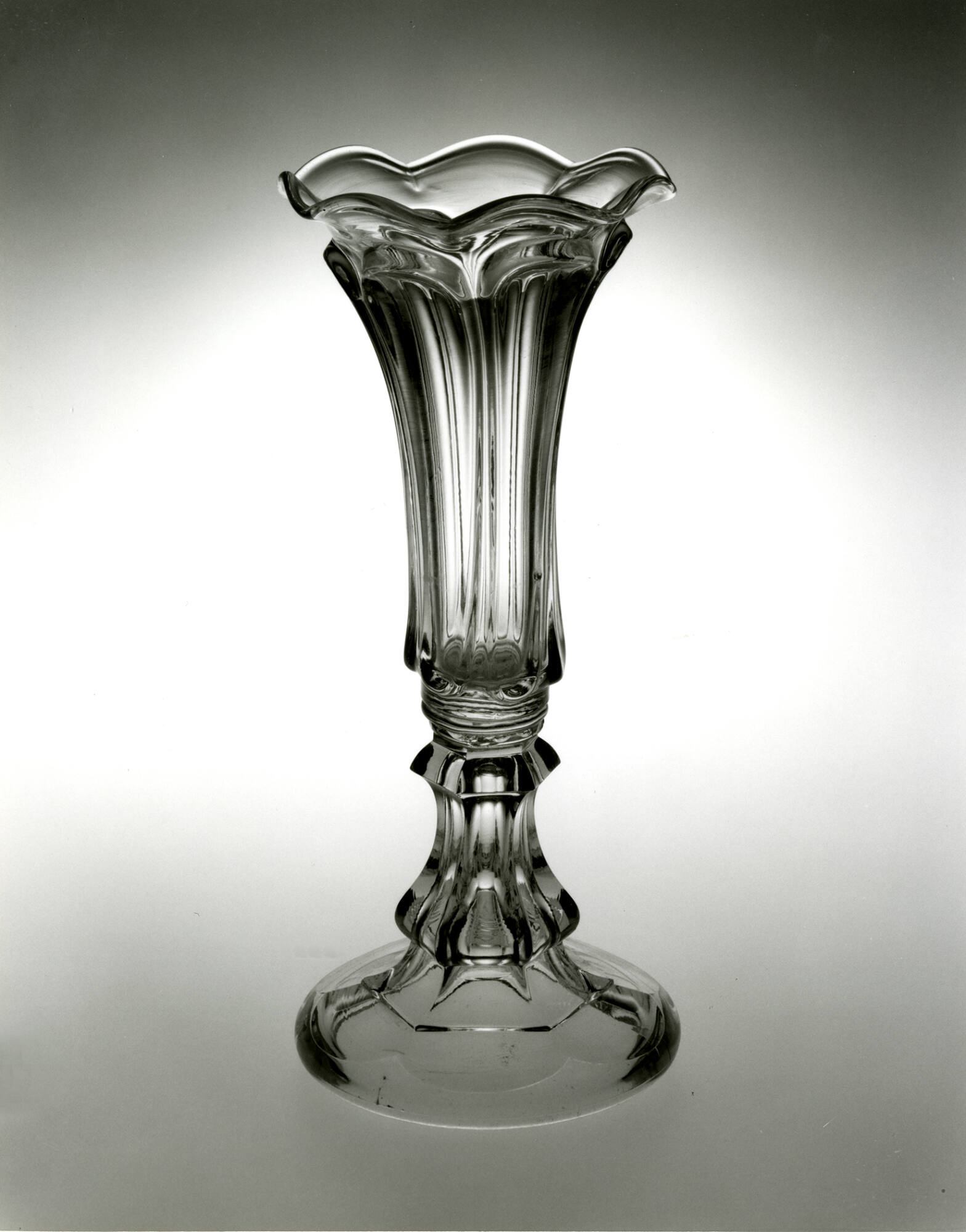 DescriptionBowl pressed upright in a female mold of an indeterminate number of vertical sections bearing the pattern of six elongated loops by a plain male plunger. Joined by a wafer to a hexagonal standard on a circular foot. Standard and foot pressed in the same manner and the same mold as 1965.25. Rim tooled into seven flutes. No pontil mark.